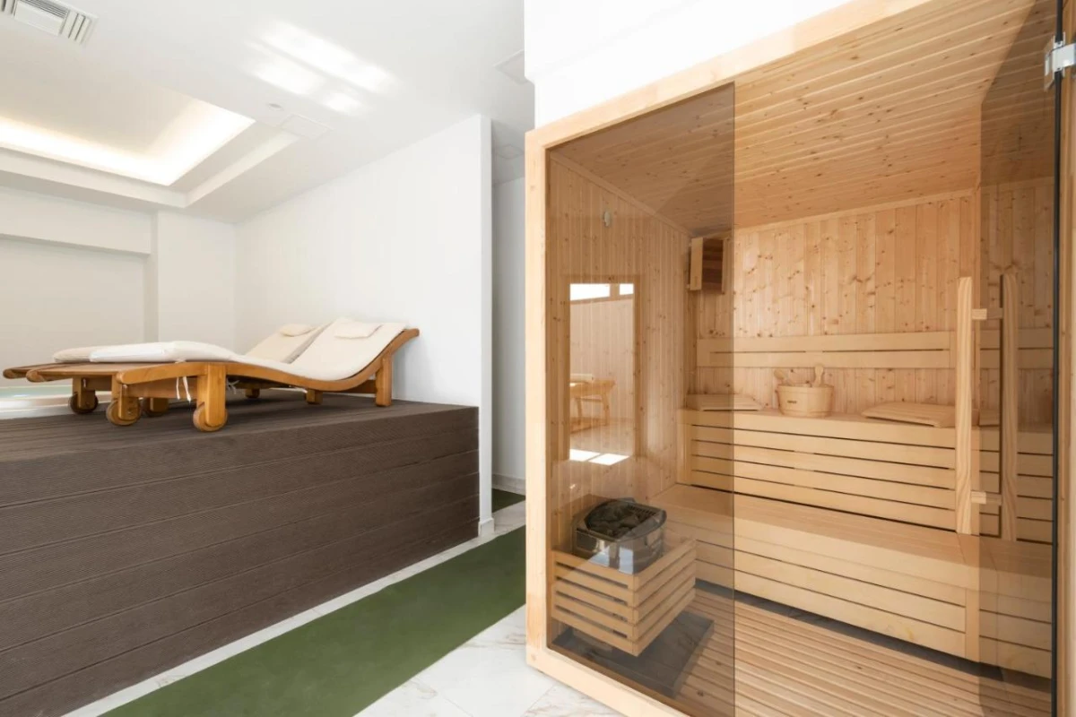 The suites, designed with a fusion of minimalist white tones and warm wooden textures, create an atmosphere of understated elegance. Each air-conditioned haven features flat-screen satellite TVs, private bathrooms with sleek bidets, and expansive terraces that capture breathtaking sunset views. Select suites elevate indulgence with private pools, jetted tubs, or spa baths, inviting guests to unwind in secluded comfort. A seasonal outdoor pool with Jacuzzi facilities and a tennis court beckon for leisurely afternoons or active pursuits, while the fitness centre caters to those seeking an energizing workout.