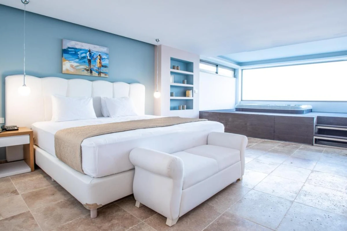 White Rock of Kos, an adults-only five-star retreat in Kefalos, Kos, enchants with its elevated position overlooking the shimmering Aegean Sea, offering a serene blend of modern luxury and island allure.