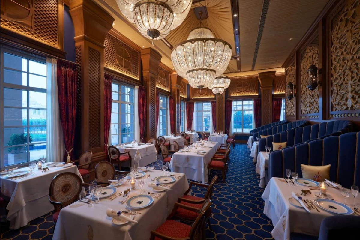 The 104 suites and four presidential villas, set across 300 acres, feature elegant interiors with plush bedding, spacious seating areas, and private bathrooms with deep tubs or rain showers. Each space, adorned with intricate Indian motifs, offers sweeping views of the rugged hills or manicured gardens, creating a regal yet serene escape.