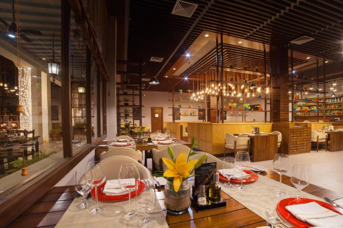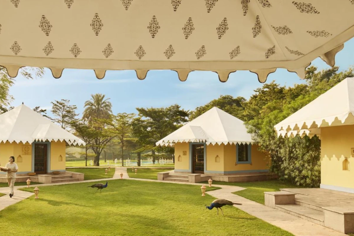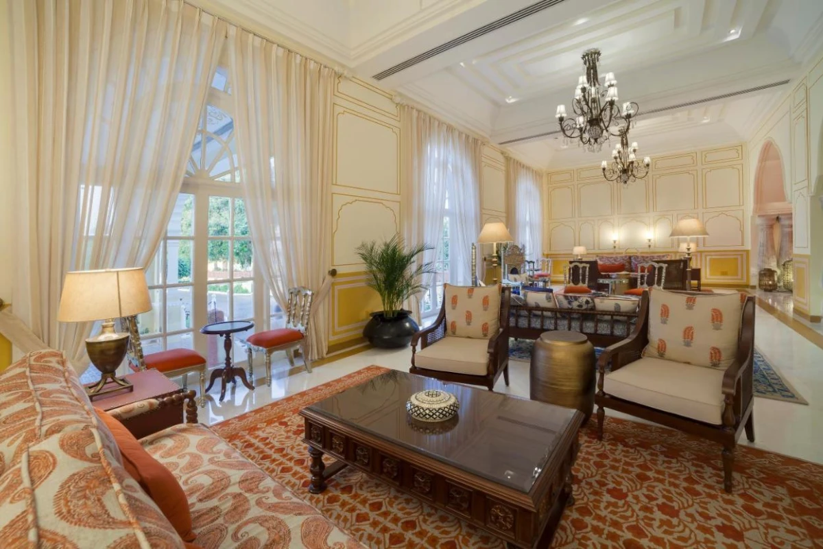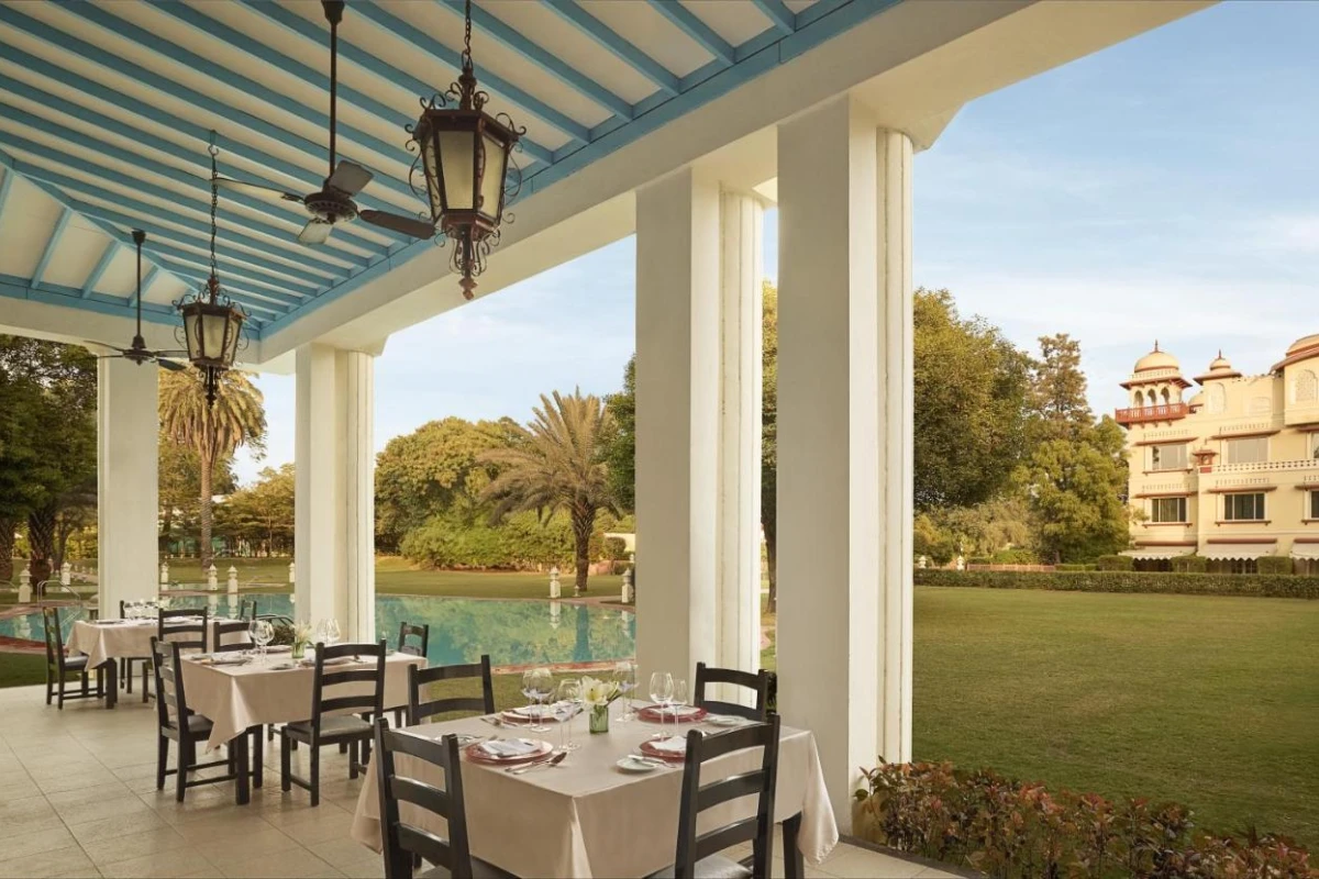 The 100 rooms and suites, blending classic Indian decor with modern elegance, feature solid wooden floors, plush bedding, flat-screen TVs, and luxurious bathrooms with deep bathtubs. Each space, adorned with intricate Rajasthani motifs, offers views of manicured gardens or charming colonnades, creating a royal retreat for discerning travellers.