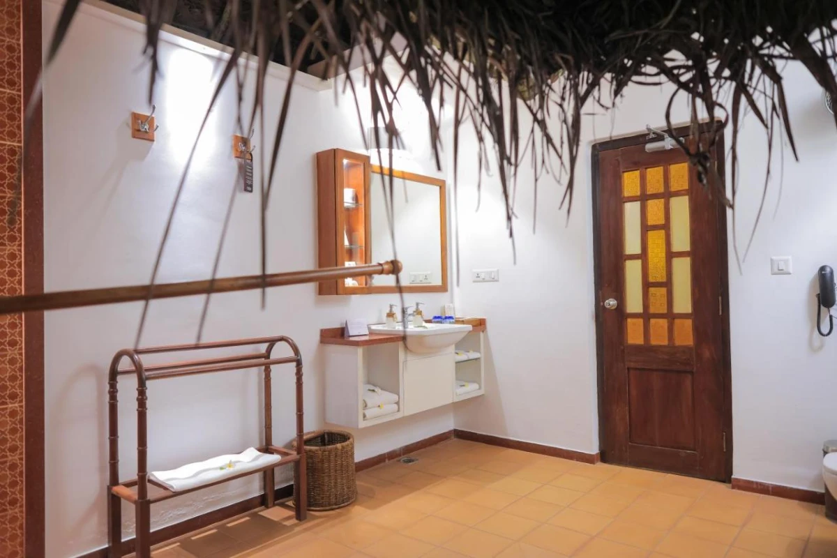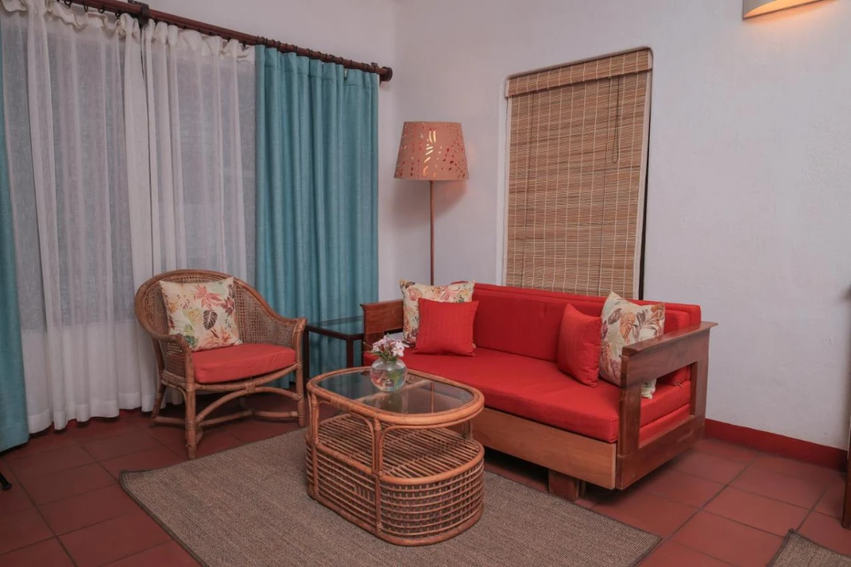 The 62 accommodations, modeled after traditional fishermen's dwellings, blend rustic Kerala aesthetics with modern comforts, featuring polished wooden floors, plush bedding, electric kettles, and private bathrooms with premium toiletries. Each villa, connected by stone-flagged pathways, offers tranquil garden or pond views, creating an intimate haven for relaxation.