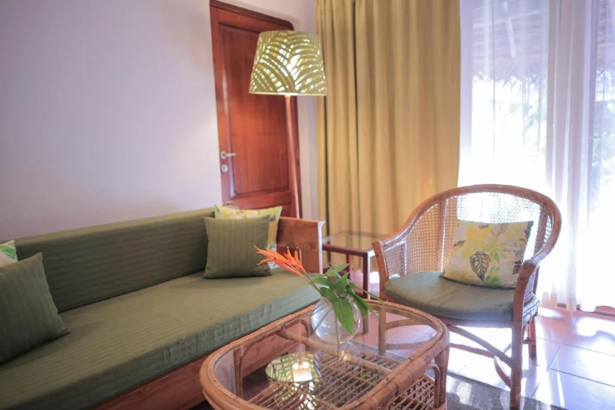 Extensive grounds with coconut trees and exotic plants throughout. This is so large, everything is spread out and the large, thatched villas are widely separated. The rooms have an excellent choice...