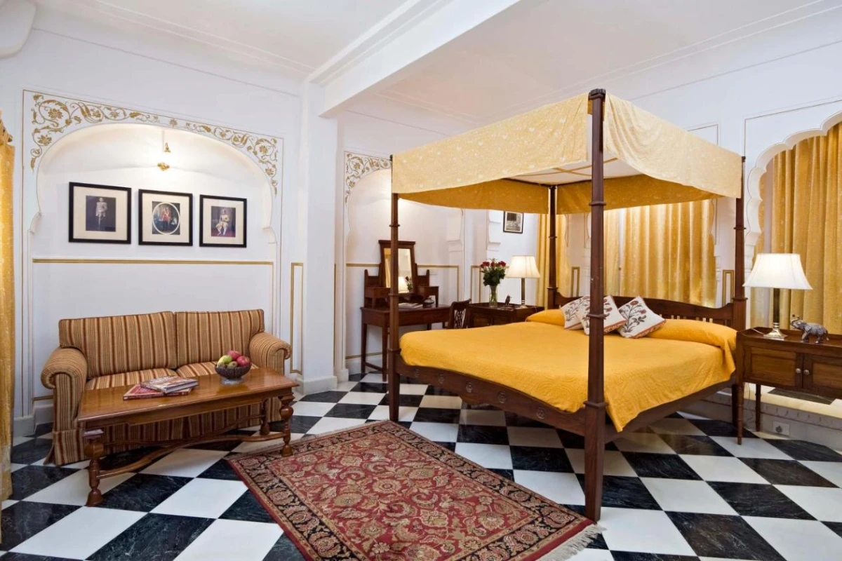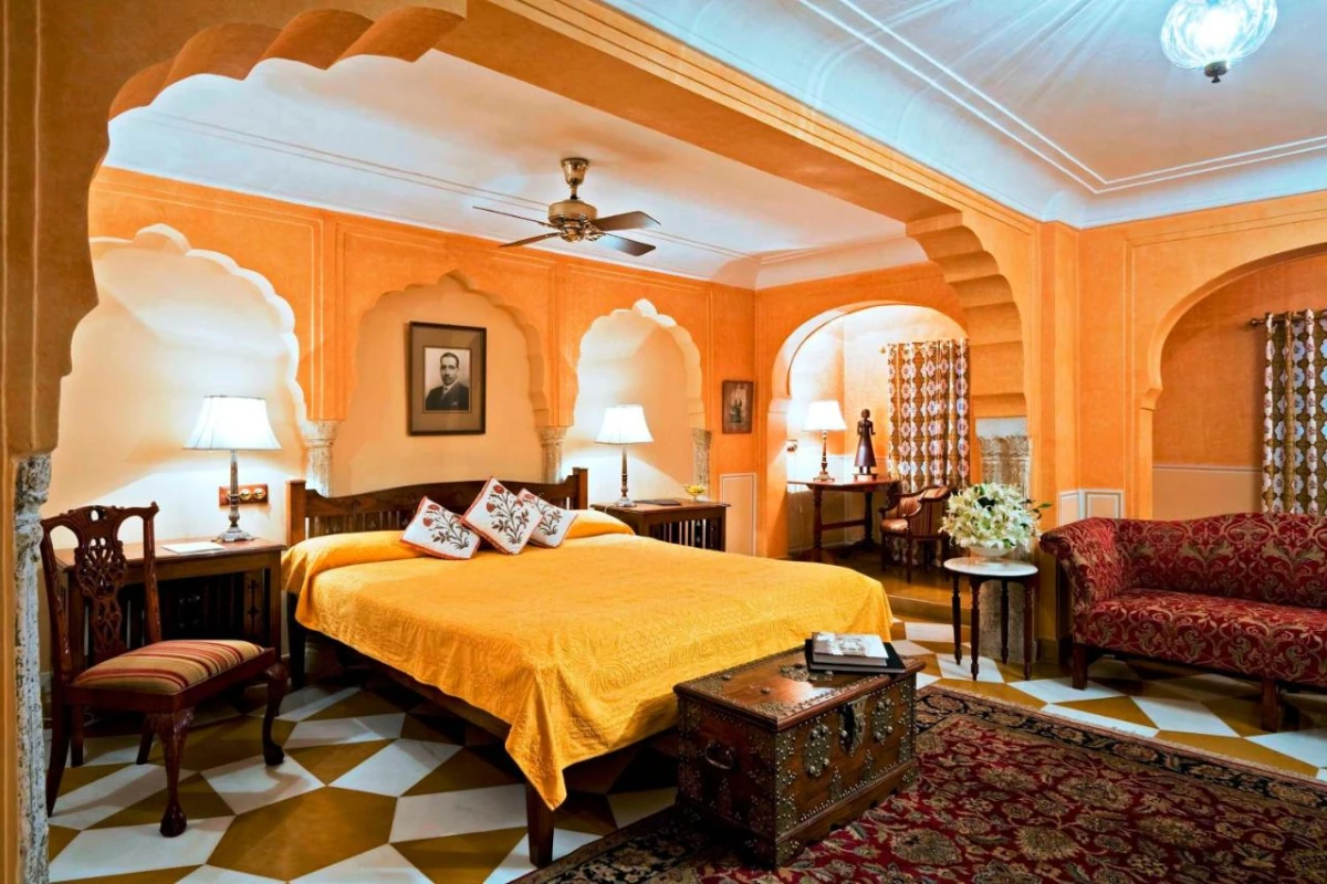 The 39 rooms, adorned with antique couches, rich mosaics, and hand-painted arches, feature plush bedding, flat-screen TVs, minibars, and private bathrooms with bathtubs, showers, and premium toiletries. Each space, reflecting Rajasthani artistry, offers views of lush courtyards or the iconic elephant ramp, creating an intimate royal retreat.