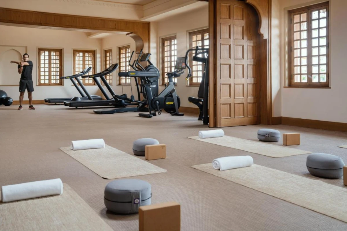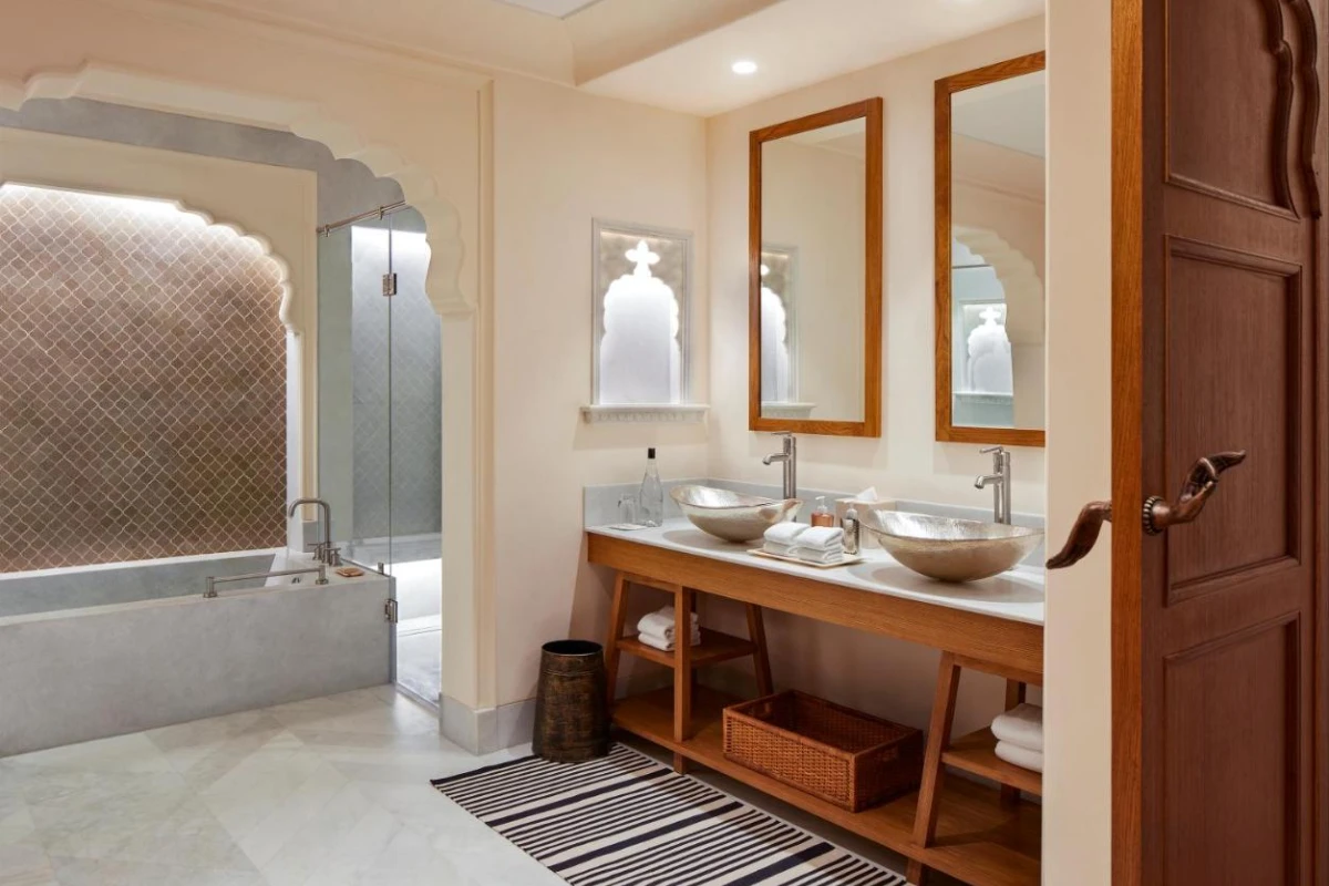 The 48 suites, crafted in contemporary Rajasthani style, feature Shekhawati art, latticework, embroidered furnishings, and handmade mattresses. Spacious bathrooms with bathtubs, along with private terraces, hot tubs, or plunge pools, offer views of the lake or Aravali hills, blending regal heritage with modern luxury.