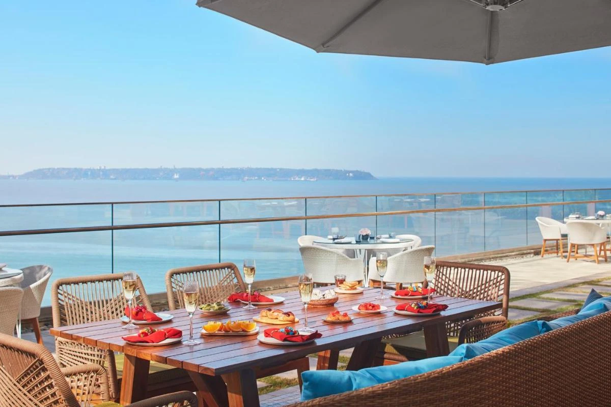 Dining at Taj Cidade de Goa Horizon is a culinary delight. BLD, an all-day multi-cuisine restaurant, serves quick bites and decadent dishes, with an alfresco terrace boasting stunning sea views. C2C crafts coastal cuisine from around the world, paired with Arabian Sea vistas, and The Banyan, an Eat-Bar named after a 200-year-old tree, offers artisanal cocktails. The 25-meter lap pool and rooftop infinity pool provide breathtaking seascapes, while J Wellness Circle rejuvenates with holistic spa treatments. A state-of-the-art fitness centre energizes guests, and a 30-seat cinema adds a unique touch. Curated experiences, from e-biking to water sports and sunset cruises, immerse guests in Goa's vibrant culture, with the hotel's vast conference facilities hosting grand events.