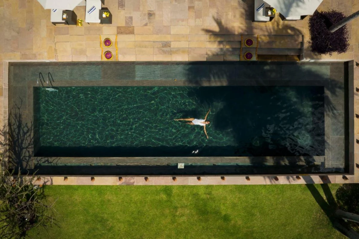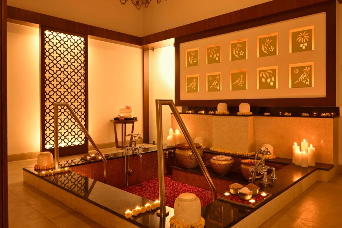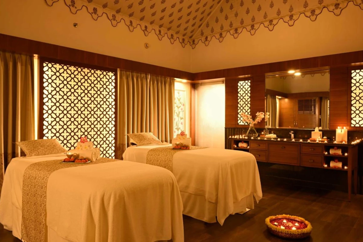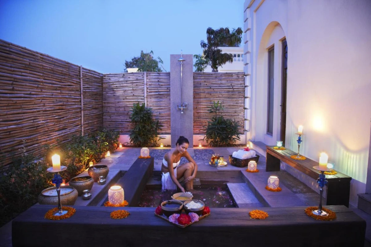 Dining at Taj Nadesar Palace is a refined experience. The sun terrace serves a daily breakfast, while evening poolside barbecue dinners offer a mix of Indian and international flavours, accompanied by live instrumental music from 7:00 PM to 10:30 PM. Guests enjoy a traditional welcome drink and complimentary fruit platter on arrival. The Jiva Spa rejuvenates with ancient Indian aromatherapy, massages, and body scrubs, while palace butlers arrange yoga classes, golf, or river cruises along the Ganges. The outdoor pool invites leisurely swims, and curated experiences, like the evening Aarti ritual at Nadesar Mata Temple, immerse guests in Varanasi's spiritual heritage.