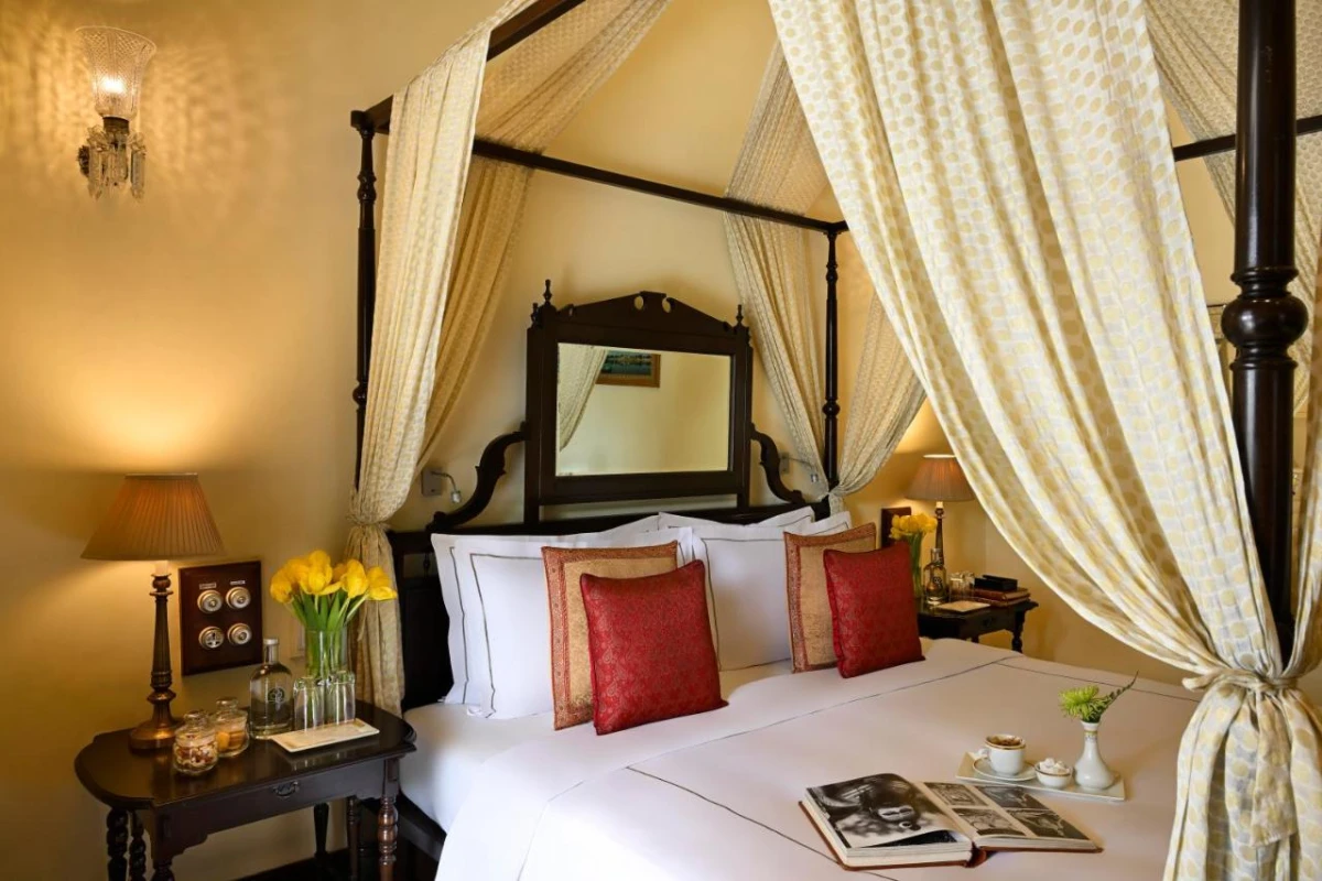 Taj Nadesar Palace, a five-star heritage hotel in Varanasi, Uttar Pradesh, sits amidst mango orchards and jasmine fields, blending regal history with luxurious serenity.