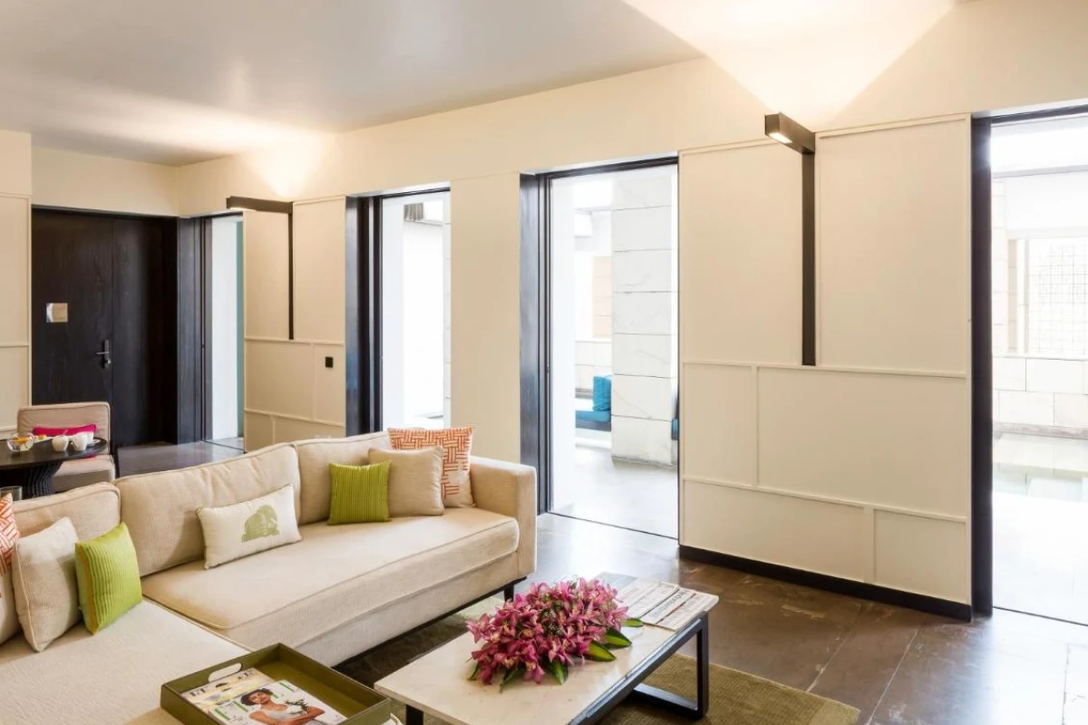 Each of the 70 indulgent rooms and suites is designed for refined comfort, featuring air-conditioned spaces with plush seating areas, work desks, wardrobes, CD players, minibars, and flat-screen TVs with satellite channels. En suite four-fixture bathrooms are stocked with premium toiletries, while private balconies or plunge pools offer tranquil views, blending modern luxury with understated elegance. The hotel's Les Clefs d'Or Concierges craft bespoke excursions, ensuring a tailored exploration of Delhi's cultural tapestry.