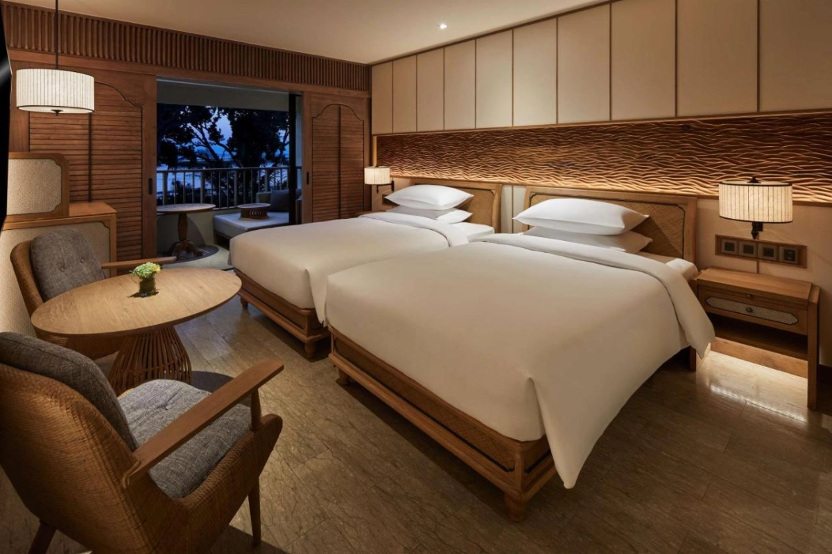 Each room at Hyatt Regency Bali embodies modern Balinese elegance, featuring wooden furnishings, flat-screen televisions, and coffee/tea facilities for effortless comfort. Private balconies or terraces with daybeds open to tranquil garden or Indian Ocean views, while en-suite bathrooms provide refreshing showers, hairdryers, and premium amenities, with select rooms granting exclusive lounge access for added refinement.