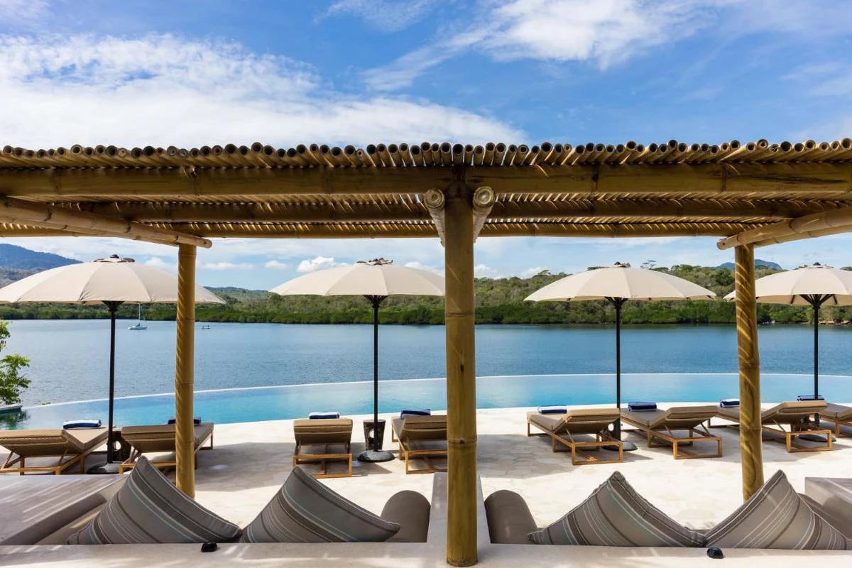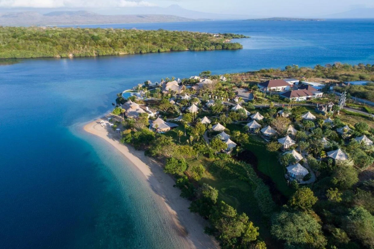 Menjangan Dynasty Resort, Beach Camp and Dive Centre, an eco-friendly glamping resort in the unspoilt north of Bali on a secluded peninsula spanning over 16 hectares, merges high-quality bamboo structures with African safari tents for a harmonious blend into the natural landscape, offering intimate privacy amid a rare white sandy beach and panoramic views of Bali National Park mountains, East Java, and Menjangan Island.