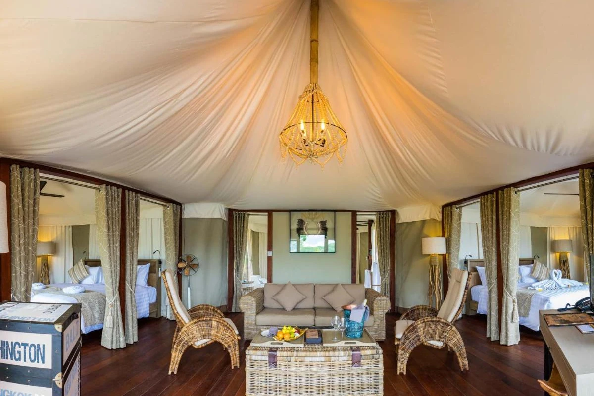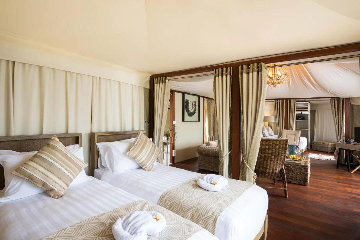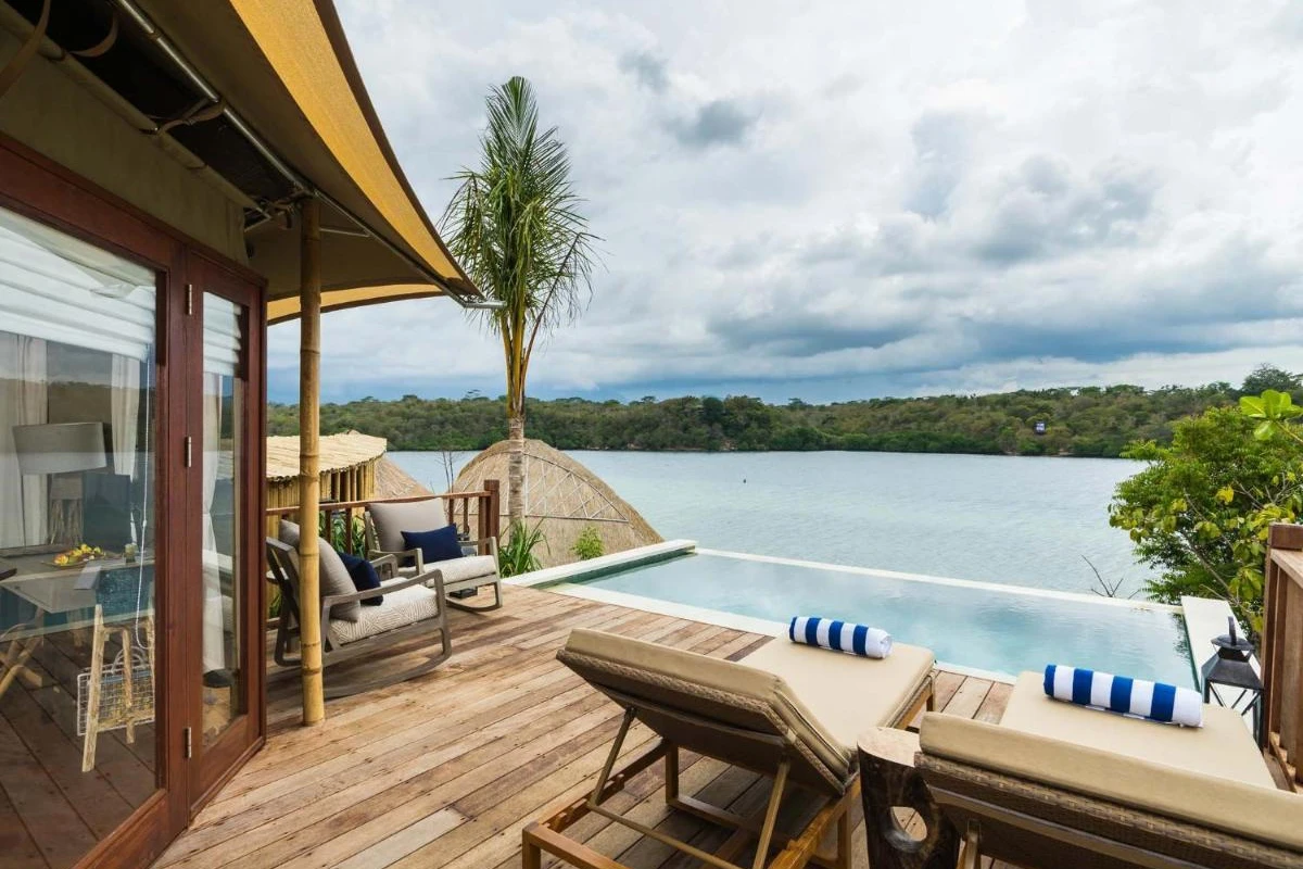 Each premium tent villa unfolds with thoughtful furnishings, including a flat-screen LED television, air conditioning for gentle comfort, a minibar, coffee and tea facilities, a spacious wardrobe, and a personal safe. En-suite bathrooms provide a deep bathtub for soothing soaks, while select villas feature a private infinity pool overlooking the sea, creating a secluded nook attuned to the surrounding wilderness.
