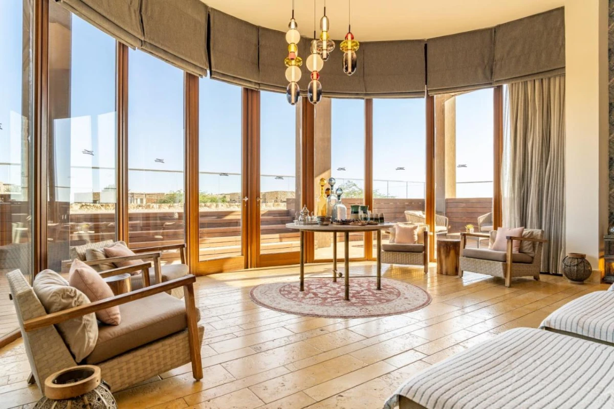 The 111 villas, spread across 12.5 acres, feature air-conditioned spaces, 42-inch LCD TVs, Nespresso machines, minibars, and spacious bathrooms with baths, showers, bathrobes, and premium toiletries. Private balconies or terraces, many with private pools, open to desert or crater views, crafting an intimate haven for couples or families. A summer outdoor pool adds a refreshing touch. Two rooms are adapted for disabled guests.