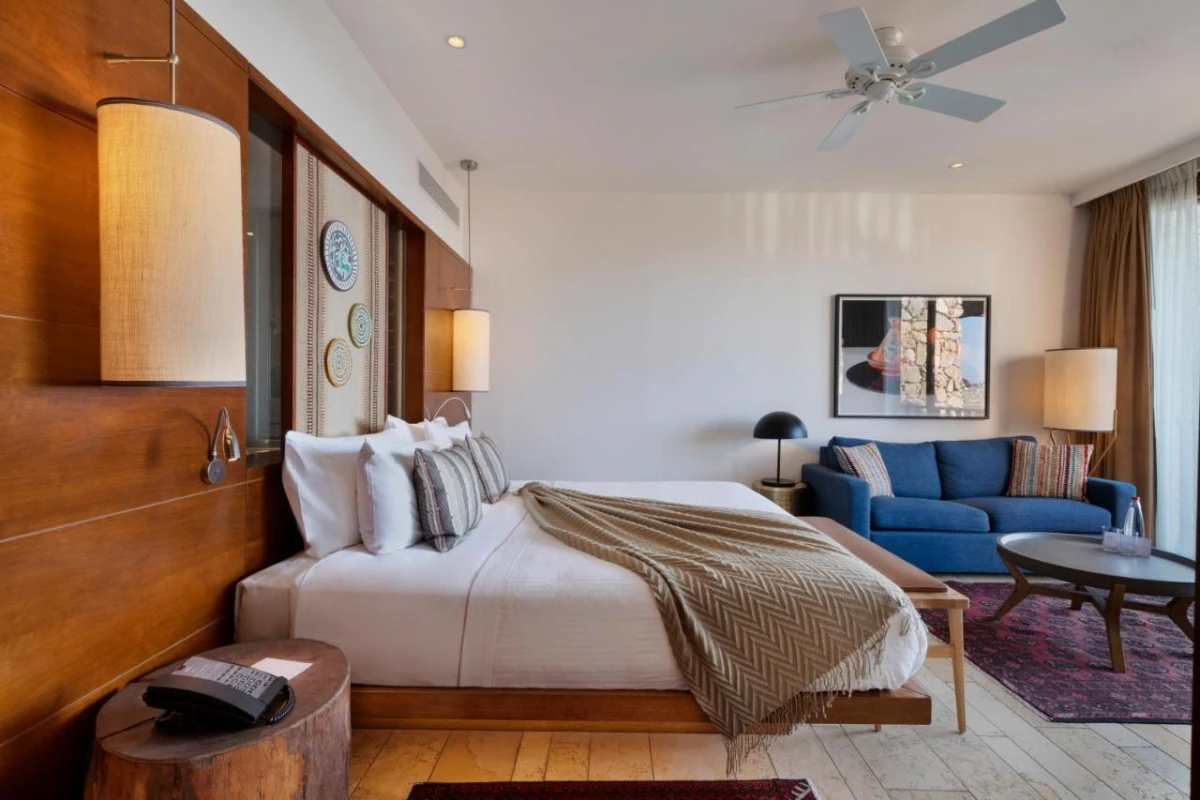 Rosemary restaurant serves buffet breakfasts with fresh fruits and gourmet dishes using local produce, enjoyed through large glass windows framing the desert. A poolside bar crafts cocktails, paired with soft regional melodies, weaving a refined yet inviting ambience.
