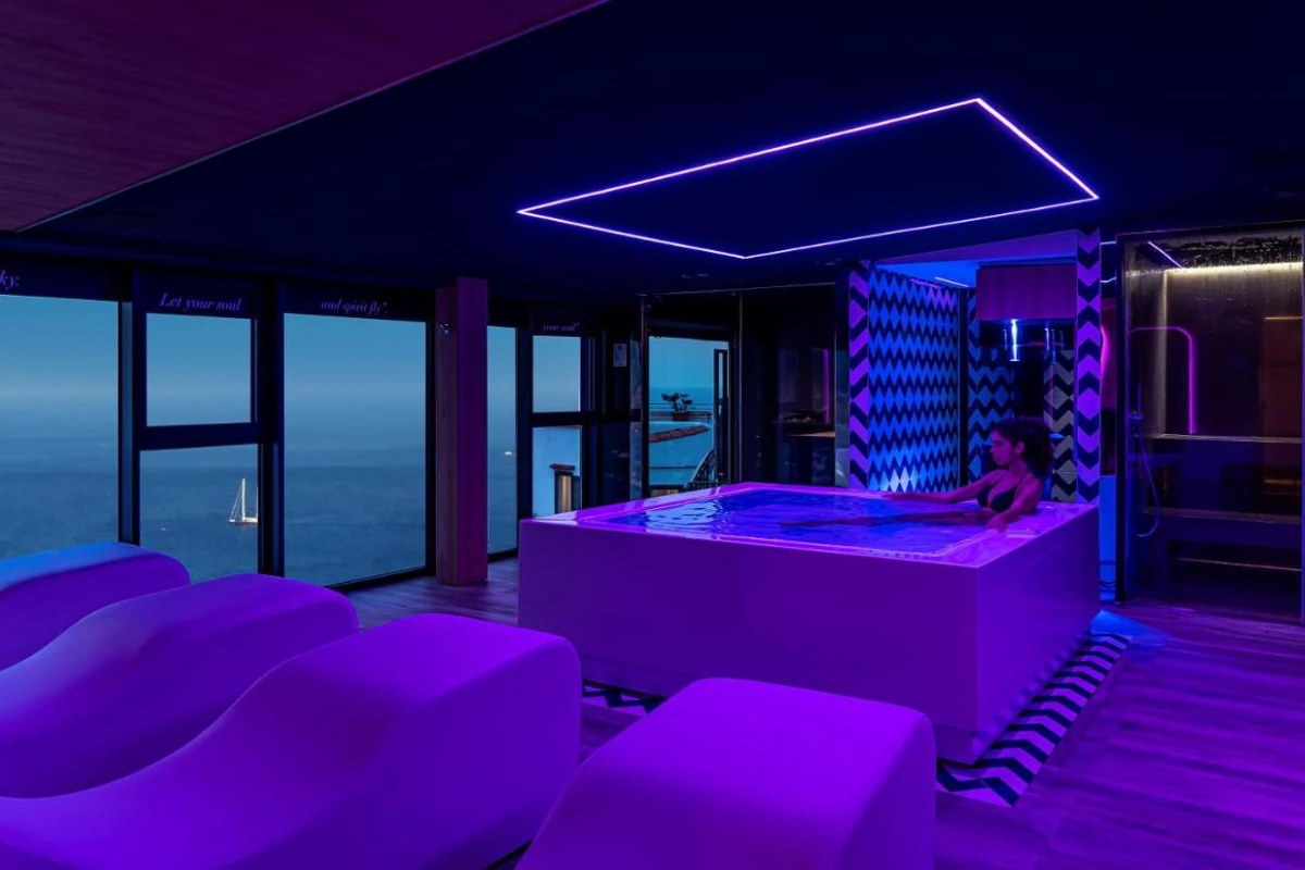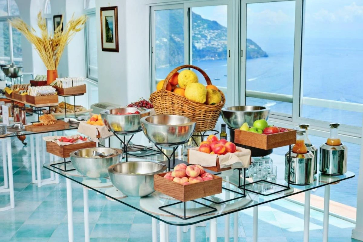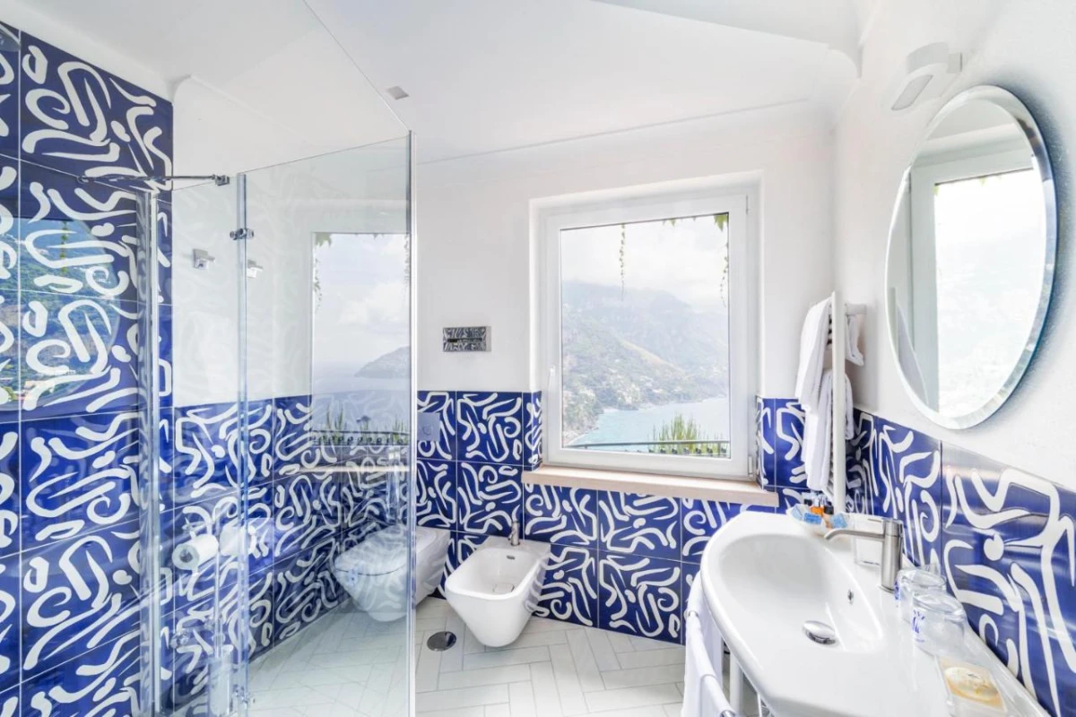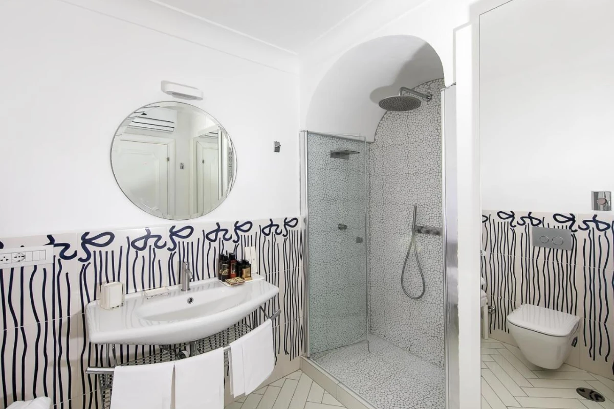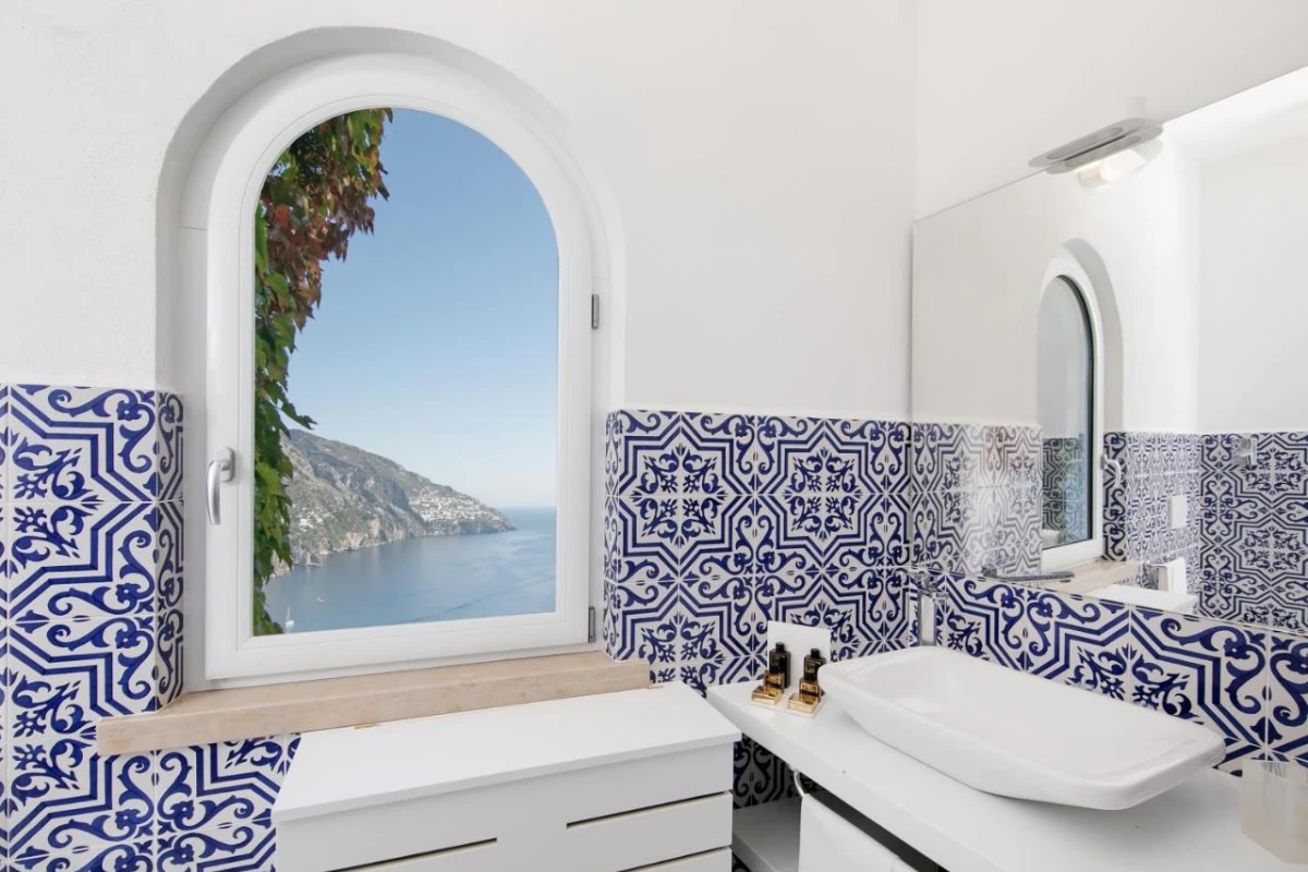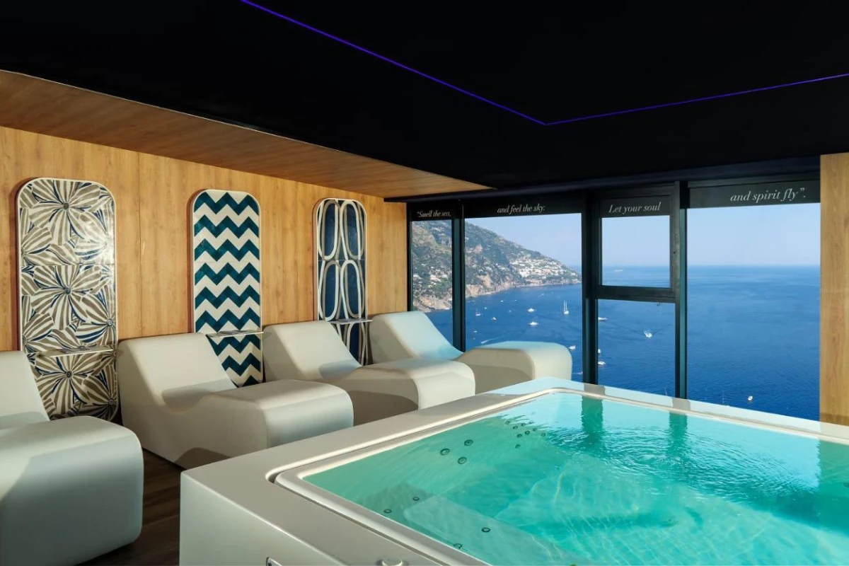 The 55 elegantly designed suites and rooms blend modern luxury with Mediterranean charm, featuring air conditioning, satellite TVs, Nespresso machines, minibars, and private bathrooms with baths or sensory showers and Ortigia toiletries. Each opens to a spacious balcony or terrace overlooking the turquoise Tyrrhenian Sea, with some suites boasting hot tubs. The design, with soft whites and nautical blues, evokes Positano's coastal allure.