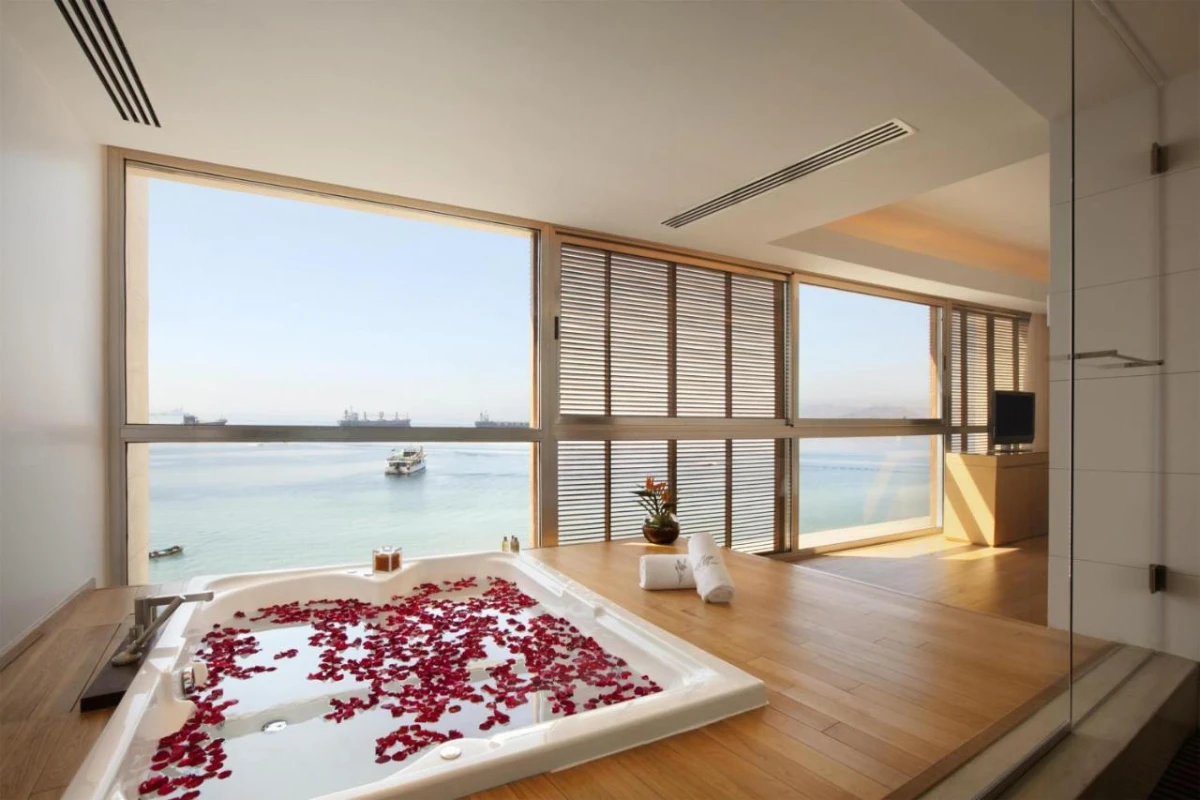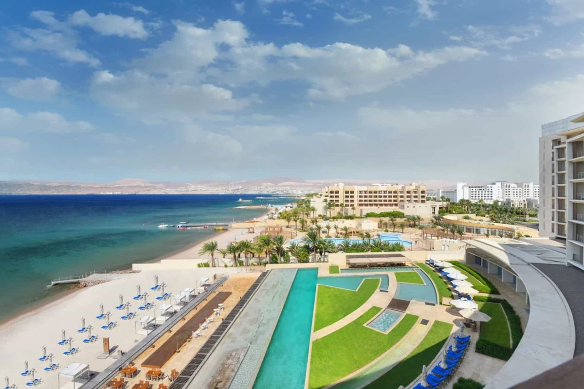 The Kempinski Hotel Aqaba, a five-star retreat along the Red Sea's pristine shores, captivates with its iconic teardrop design, blending Jordanian hospitality with European sophistication in the vibrant heart of Aqaba.
