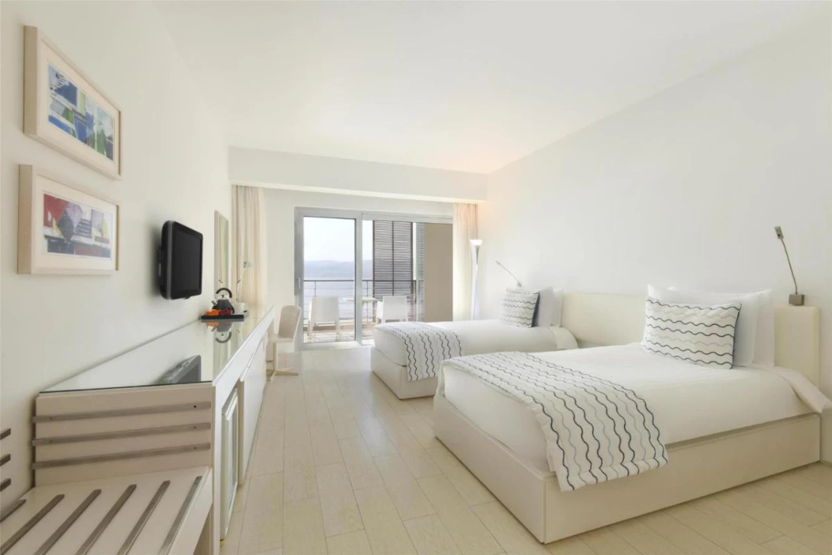 The 200 rooms and suites exude airy elegance, featuring plush bedding, air-conditioned serenity, and floor-to-ceiling windows that open to private balconies with uninterrupted Red Sea views. Each room offers flat-screen satellite televisions, curated minibars, and spacious bathrooms with luxurious bathrobes and toiletries, crafting a refined haven for discerning travellers seeking coastal tranquility.