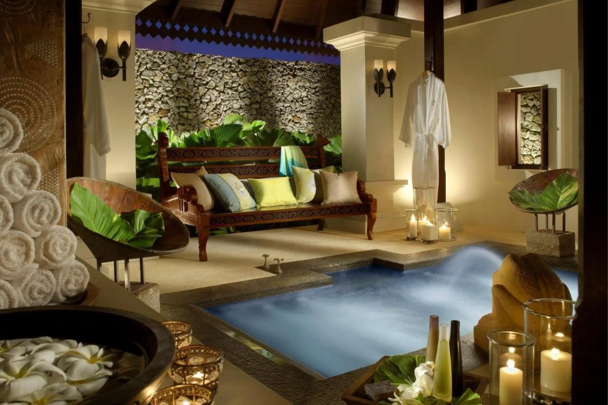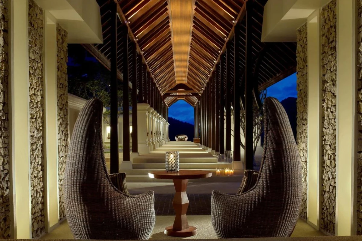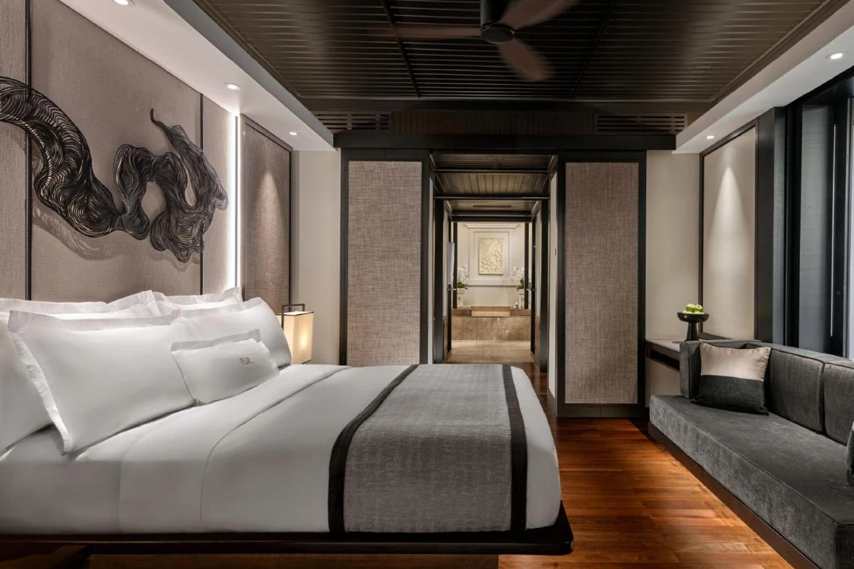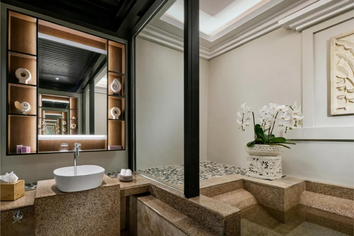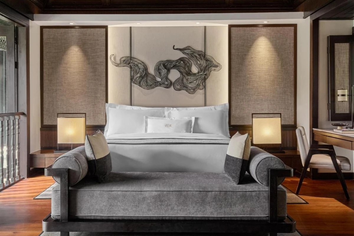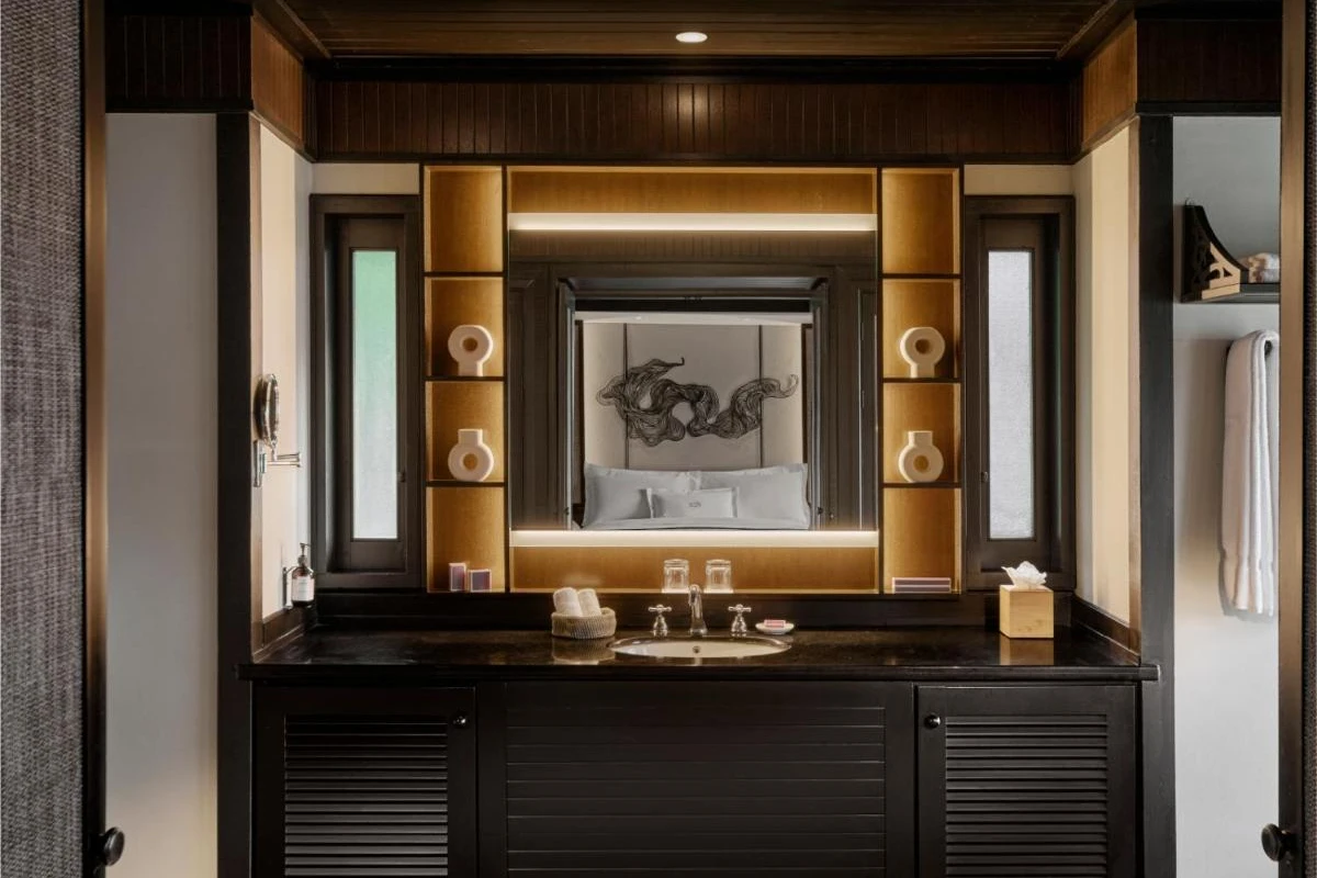 Airy villas, some perched on stilts over lapping waves and others tucked into tropical gardens, open to large balconies with loungers for soaking in sea or forest views, each equipped with a flat-screen television, desk, minibar, and en suite bathroom featuring an oversized tub for indulgent soaks. The stilted overwater bungalows, linked by wooden walkways, offer a serene escape, with select villas granting direct access to the four-acre Spa Village for tranquil treatments beside an exclusive lap pool.