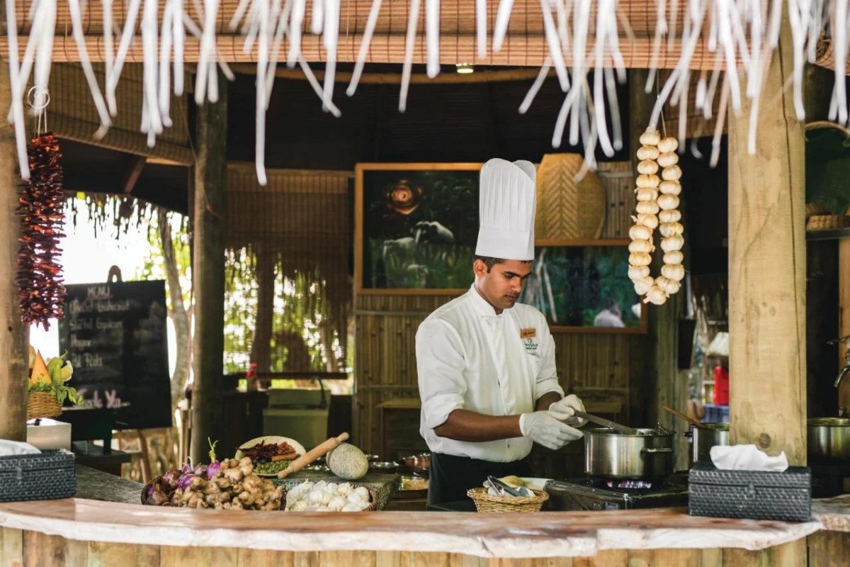 Dining is a vibrant journey across seven exquisite venues. The Spice serves international buffets with live cooking stations, while Just Veg, the Maldives' first pure vegetarian restaurant, delights with Mediterranean, Arabic, and Indian flavours, including Jain cuisine. The Sunset offers à la carte dining and Teppanyaki Grill, and Pier Six, shaped like a manta ray, presents seafood and Japanese specialties. Ceylon Bliss crafts Sri Lankan street food, and two pool bars, The Liquid and Sunset, serve premium wines, spirits, and cocktails by the adults-only and family pools. The Akiri Spa by Mandara, with six treatment rooms, a Jacuzzi, sauna, and steam room, offers Maldivian-inspired therapies. Guests can enjoy complimentary snorkeling, sunset fishing, non-motorized water sports, padel tennis, a flood-lit tennis court, sunrise yoga, and a gym. Curated excursions, like visits to Naifaru or Vavvaru Island's marine station, immerse guests in the Maldives' natural beauty.