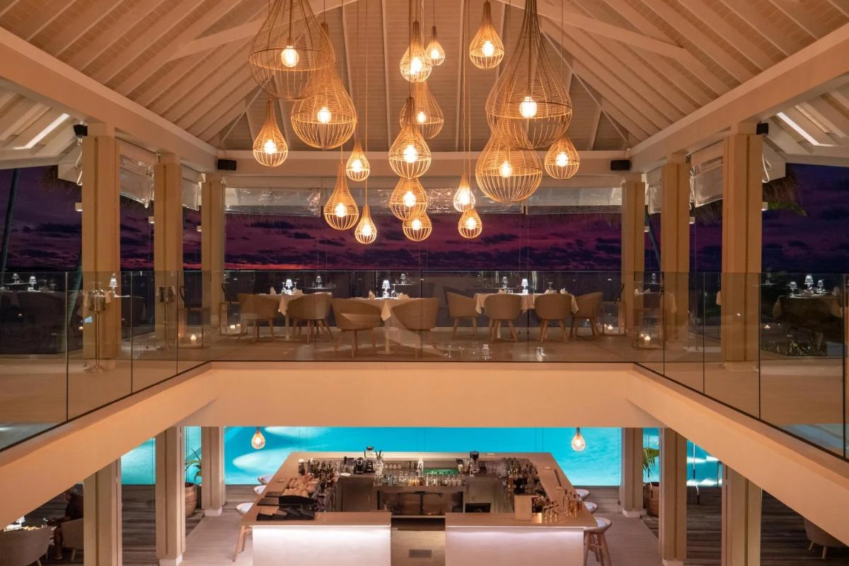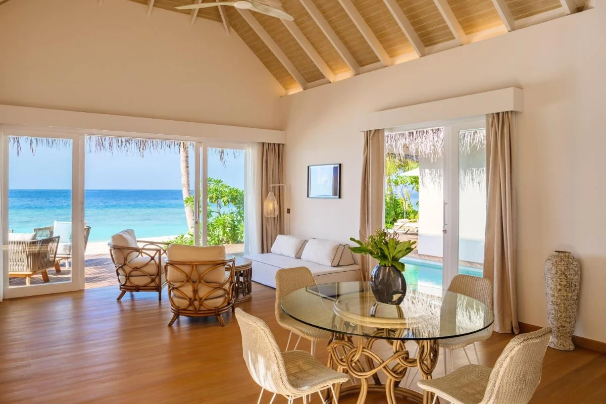 Each of the 85 villas exudes tropical sophistication, featuring air conditioning, flat-screen TVs, minibars, and spacious bathrooms with premium toiletries. Select villas offer private balconies or terraces with breathtaking lagoon or ocean views, while others include private pools for ultimate seclusion. The design, infused with natural wood and soft tones, creates a refined sanctuary that harmonizes with the island's lush environment.