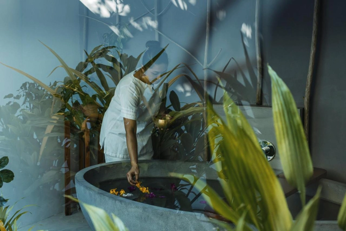 The 180 villas and bungalows, featuring sleek flat roofs and clean lines, include Beach Villas, Overwater Bungalows, and Suites, each with air conditioning, coffee machines, flat-screen TVs, minibars, and private bathrooms with bidets, bathrobes, and slippers. Private terraces or decks offer stunning ocean or garden views, preserving 80% of the island's ancient trees for a natural, refined sanctuary.