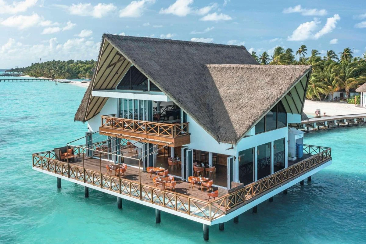 Dining captivates at two restaurants. Alita offers all-day international buffets with daily themed dinners, featuring indoor and al fresco seating by the main pool. Vista, an over-water Italian restaurant, serves exquisite dishes with panoramic lagoon views. The Pool Bar crafts light snacks and refreshing cocktails. Suvadiva Spa provides rejuvenating massages, scrubs, wraps, and facials, while a large infinity pool and fitness centre enhance relaxation. The PADI 5-star Suvadiva Dive Centre offers snorkeling and diving to explore 13 shark species, with water sports like kayaking and excursions such as dolphin watching or sunset fishing adding adventure.