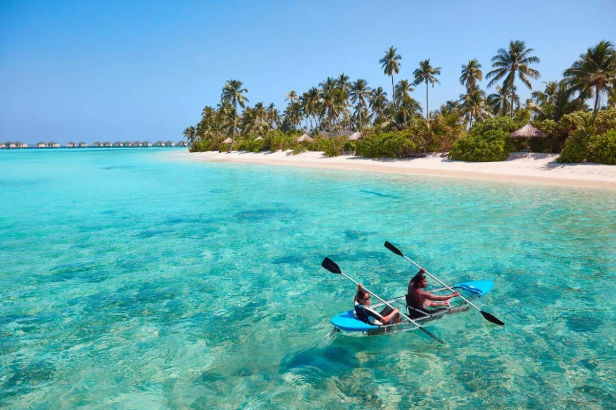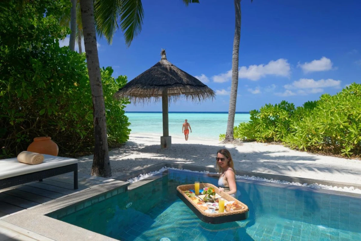 Dining captivates across five venues. REEF serves Asian delights, SURF offers grilled seafood, and Pizza Kaage provides takeaway pizzas and light meals. Iru Bar, a beachside haven, and Thari Bar, by the pool, craft cocktails, drinks, and snacks, perfect for sunset enjoyment. The spa offers rejuvenating treatments, from massages to holistic therapies, complemented by a FIT centre and beach volleyball court. Guests can snorkel or dive the vibrant house reef, play tennis, or explore via boat excursions like sunset fishing or island-hopping. A herb garden adds a sustainable touch, while an outdoor pool and kids' pool enhance leisure.
