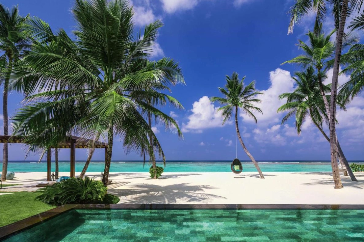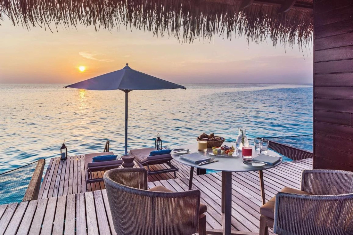 The 118 thatch-and-timber villas, including beach villas, water villas, and residences, feature opulent interiors with 300-thread-count linens, flat-screen TVs, minibars, and spacious bathrooms with sunken tubs and dual sinks. Private decks or verandas offer lagoon views with oversized hammocks, while beach villas provide direct sand access, ensuring a private, elegant retreat. Golf buggies and bikes enhance the tranquil exploration of palm-shaded pathways.