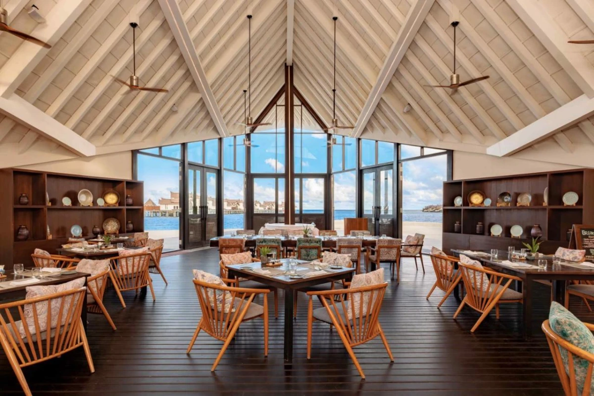 The 90 over-water and beach villas feature private swimming pools, daybeds, air conditioning, flat-screen TVs, maxi bars, and spacious bathrooms with premium toiletries. Each villa includes a deck with Indian Ocean views, some with thrilling slides from the top floor into the lagoon, creating a refined and adventurous retreat. The RESERVE Plan includes complimentary butler service, dining, beverages, and activities, ensuring a seamless stay.