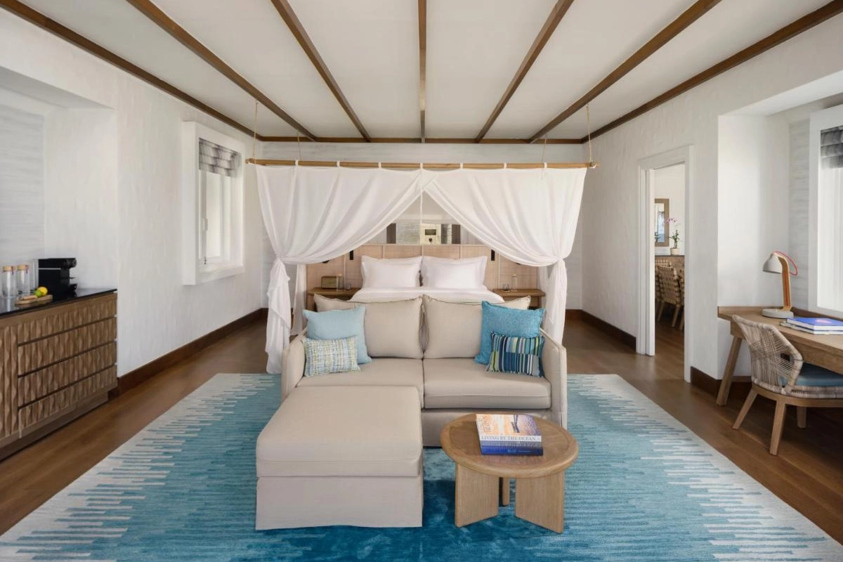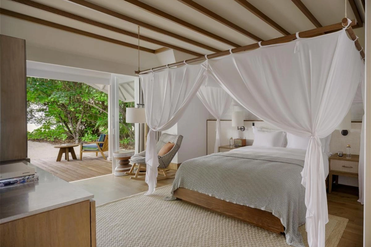The 91 villas, from beachfront hideaways to overwater sanctuaries, blend bohemian elegance with natural beauty. Each features air-conditioned interiors, flat-screen televisions, minibars, coffee machines, safes, and spacious bathrooms with premium toiletries. Private terraces or balconies, some with direct lagoon access, invite guests to bask in tropical serenity, surrounded by lush gardens or turquoise waters.