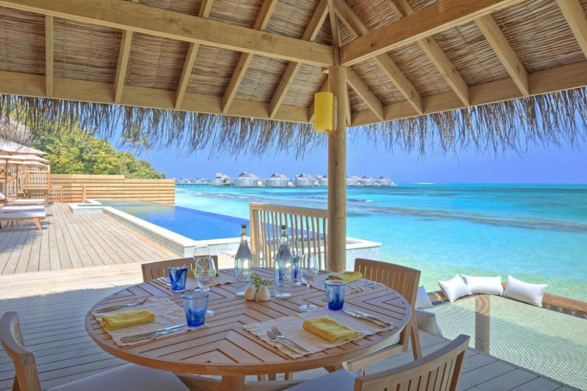 Dining is a celebration of fresh, bold flavours. LEAF, an adults-only haven above the organic garden, crafts farm-to-table dishes for intimate evenings. Longitude, a two-story overwater venue, serves international cuisine with locally sourced fish, framed by sweeping ocean views. Zen delivers Japanese fusion with live cooking stations and a sunset sushi counter. Kaji offers teppanyaki-style dining with premium seafood and beef. Sip Sip, a sunken poolside bar, dishes up homemade pizzas and burgers, while Deck-a-Dence provides zero-carbon dining at glass-bottom tables over the lagoon. The Chili Table weaves global chili-inspired courses in the garden's embrace. Chill Bar, perched overwater, hosts nightly DJ parties with artisanal cocktails, while Sake Lounge offers sake-inspired drinks, and Altitude Wine Cellar showcases over 400 vintages. The Six Senses Spa, with nine treatment nests, blends Ayurvedic and local therapies using coconut and mango, enhanced by a steam room, nail bar, and rooftop yoga studio. The Biohacking Lounge provides jet-lag relief with compression therapy. Adventure thrives with a PADI-certified dive centre exploring 42 coral-rich sites, a year-round manta ray cleaning station, and snorkeling at the house reef. Watersports like windsurfing, kayaking, and catamaran sailing abound, alongside the Yin Yang surf break. Romantic touches include private island dining, dolphin cruises, and Cinema Under the Stars.