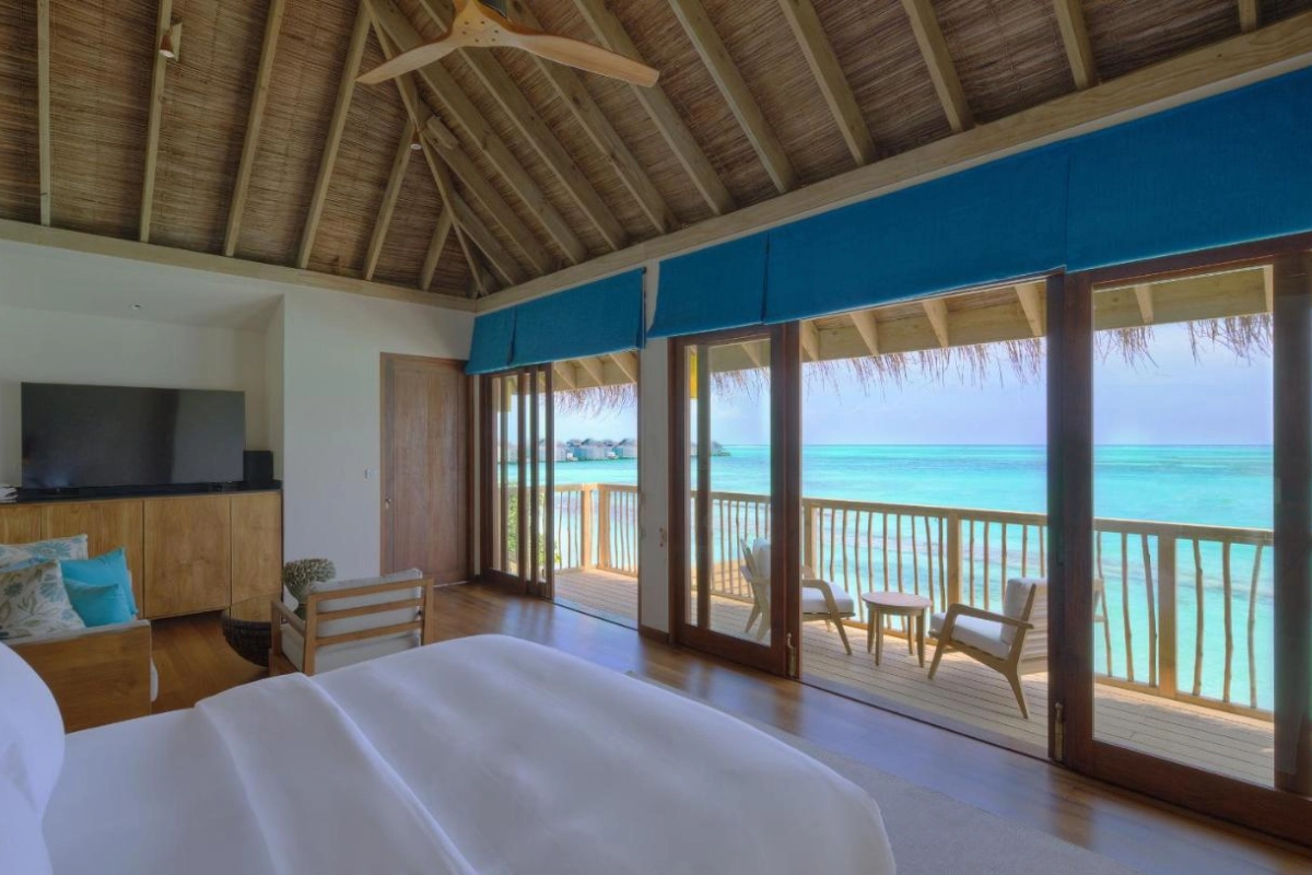 The 94 villas, split between beachfront and overwater designs, exude barefoot sophistication with natural wood accents and open-air layouts. Each features air-conditioned comfort, flat-screen televisions, Bose entertainment systems, minibars, coffee machines, safes, and outdoor bathrooms with rain showers for stargazing. Private decks with daybeds and sunloungers invite relaxation, some with direct lagoon access, blending seamlessly with the island's powdery sands and lush greenery.