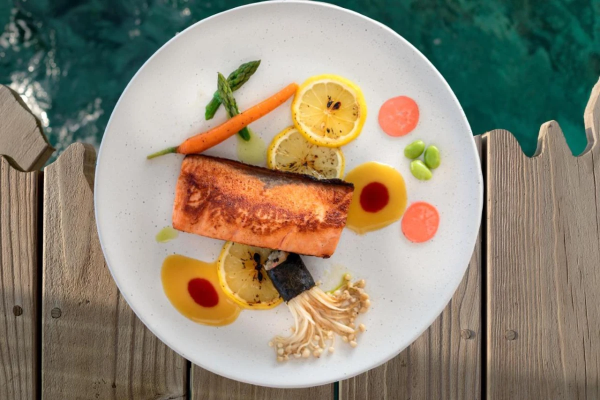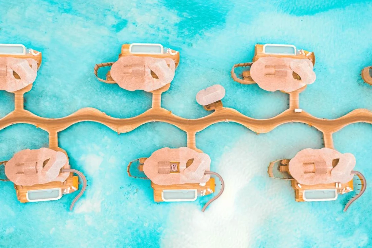 The 51 overwater villas and 8 island villas redefine indulgence, featuring rustic-modern design with natural wood textures and high ceilings. Each villa offers air-conditioned comfort, flat-screen televisions, minibars, espresso machines, safes, private wine cellars, and open-air bathrooms with bathtubs and lagoon access. Private pools and retractable roofs for stargazing elevate the experience, with select villas boasting slides from upper decks into the turquoise waters. Spacious terraces with sunloungers provide uninterrupted ocean views, blending seamlessly with the island's pristine beauty.