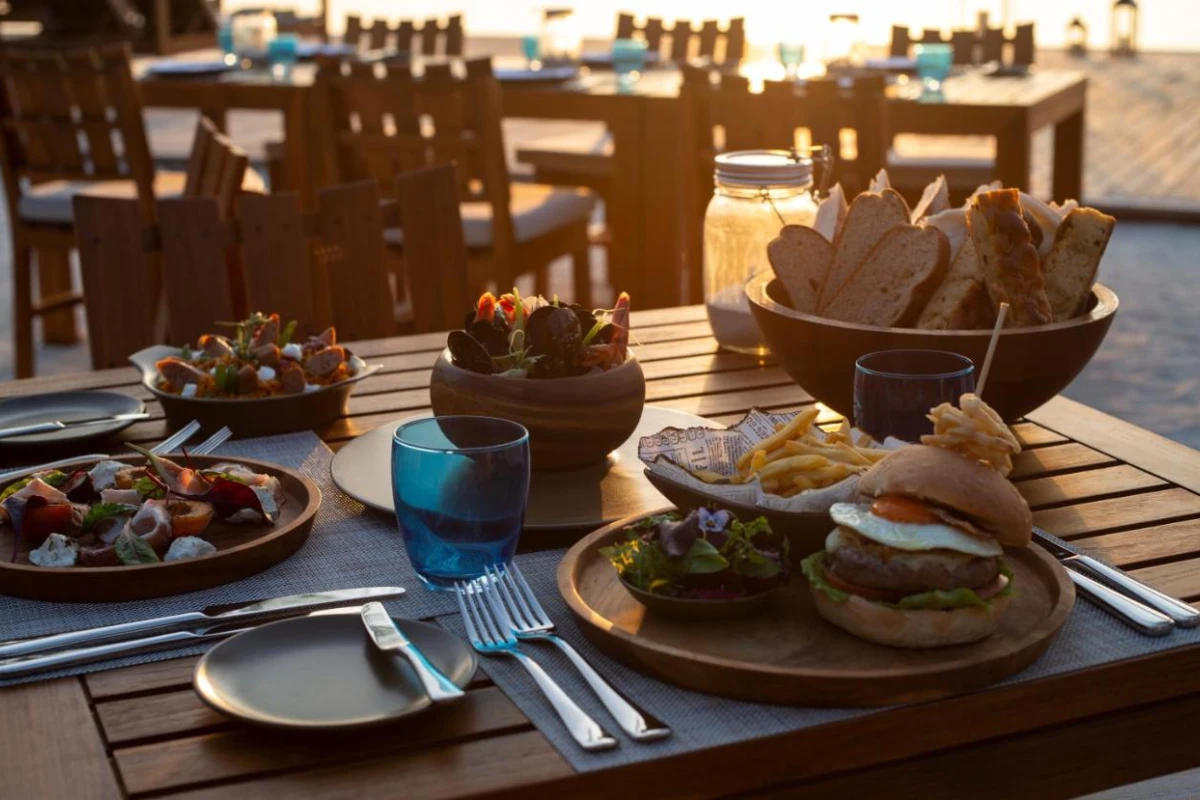 Dining is a vibrant journey across nine restaurants and six bars shared between the two islands. The Dining Room offers international cuisine with a Maldivian twist in a breezy setting, while Li Bai serves refined Cantonese dishes with ocean vistas. Café del Sol at The Beach Club crafts Mediterranean tapas with a lively, sun-soaked vibe. Falhumaa, perched on a 230-meter jetty, specializes in fresh seafood, and The Sunset Grill grills steaks under starlit skies. The Beach Bar, nestled by the infinity pool, mixes island-inspired cocktails. The Spa by Clarins, with 10 overwater pavilions, offers Ayurvedic and holistic treatments, a sauna, yoga pavilion, and nail spa. Adventure thrives with a PADI 5* Dive Centre exploring Gaafu Alifu's renowned coral reefs, teeming with sharks and turtles. Complimentary snorkeling, kayaking, and windsurfing ignite exploration, while floating fitness classes and a gym keep energy high. Unique experiences include harvesting from the Earth Basket garden for chef-led cooking classes at the Earth Table, alongside sunset cruises on a traditional dhoni to spot playful dolphins.