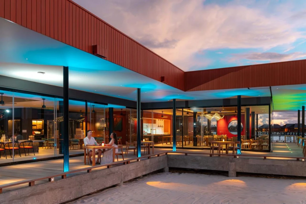 Dining captivates with vibrant flavours. Dhonveli Restaurant serves international buffets with live cooking stations in a casual, open-air setting framed by ocean breezes. Madivaru Restaurant specializes in fresh seafood and Maldivian delicacies, offering intimate overwater dining with lagoon vistas. Thundi Bar, the stylish beachfront hub, crafts cocktails in a lively yet chic atmosphere, while Athiri Bar, perched over the turquoise waters, pairs drinks with panoramic sunset views. The Araamu Spa, with overwater treatment rooms, offers rejuvenating massages, facials, and body scrubs inspired by the island's natural beauty, creating a serene escape. Adventure thrives with a PADI-certified dive centre providing snorkeling and scuba excursions to explore the vibrant house reef, teeming with marine life. Complimentary watersports like kayaking and windsurfing, alongside beach volleyball, badminton, and table tennis, keep energy high. Romantic experiences include private beach dinners, sandbank picnics, and sunset yacht cruises, enhancing the island's intimate allure.