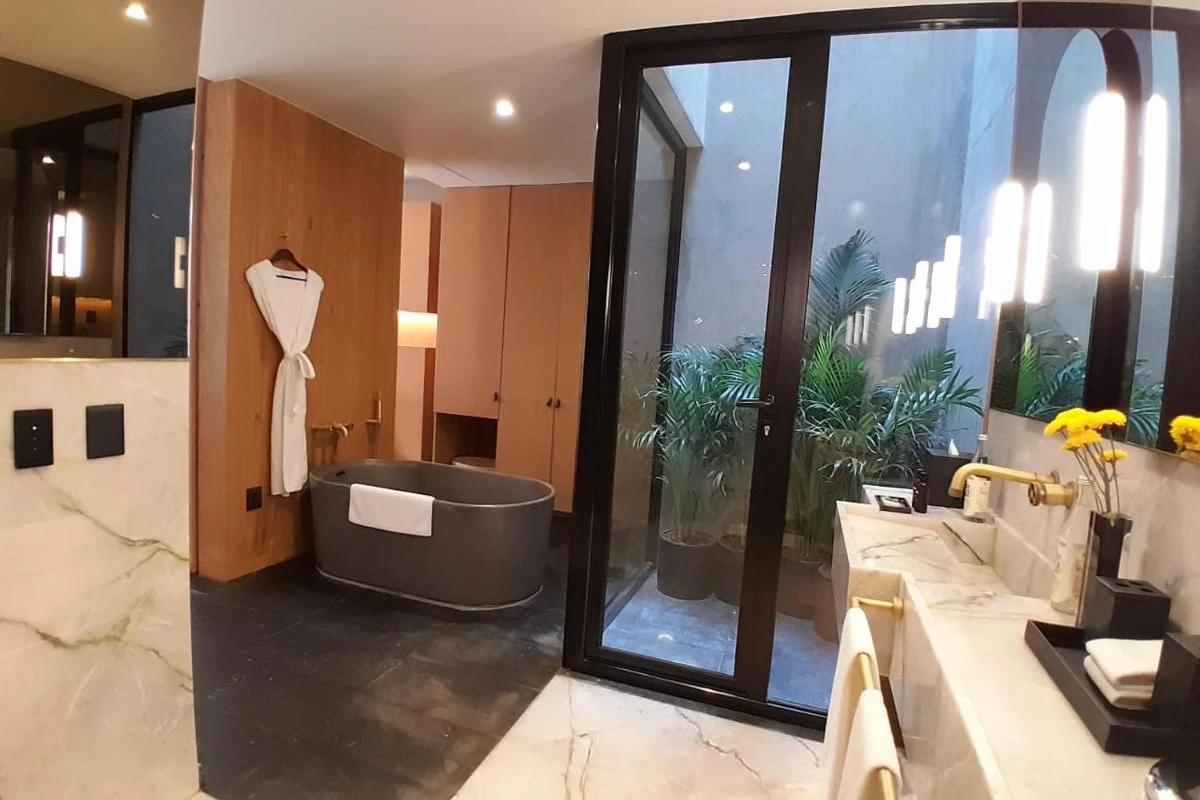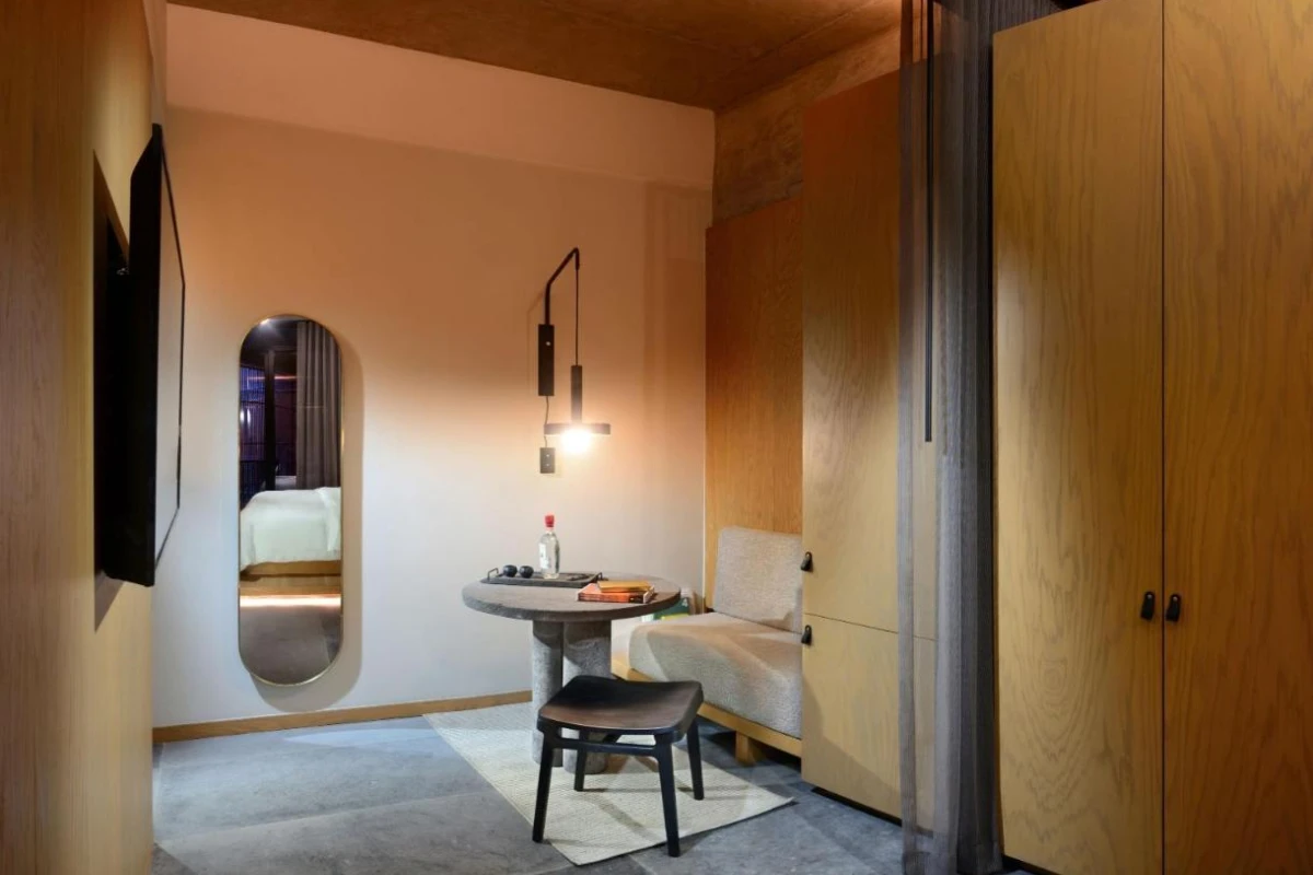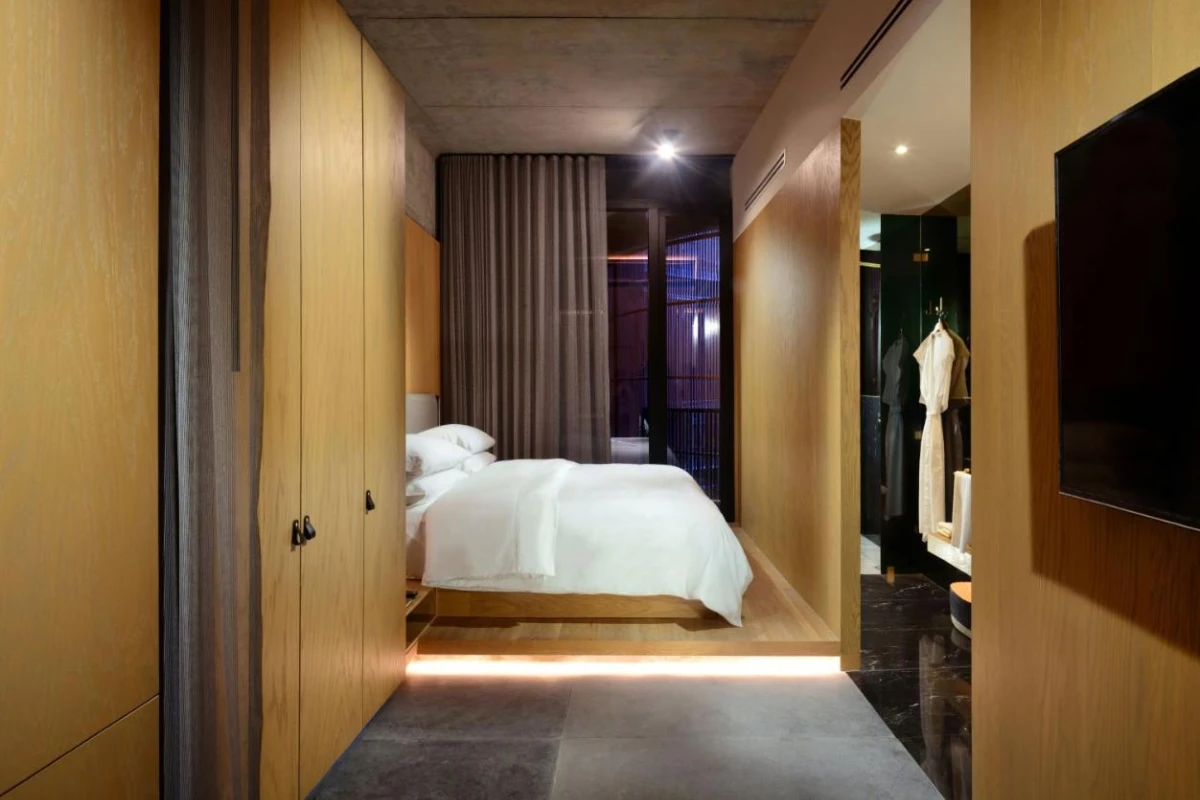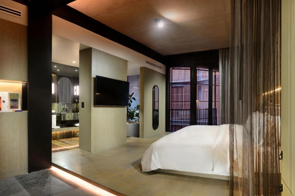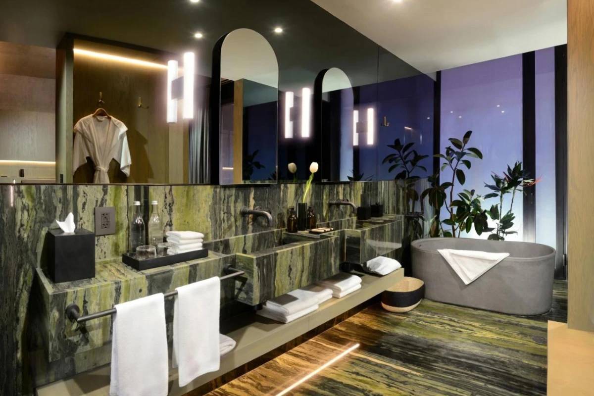 The 50 contemporary suites radiate bespoke elegance, featuring 600-thread-count linens, flat-screen TVs, coffee machines, locally curated minibars, safety deposit boxes, and marble-floored bathrooms with wide rain showers and Aromaria toiletries. Private balconies overlook a striking indoor mosaic-style patio, an artistic centrepiece, crafting an intimate haven for couples, business travellers, or cultural explorers. Complimentary Wi-Fi ensures seamless connectivity in this sophisticated retreat.