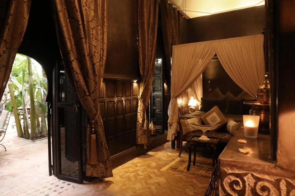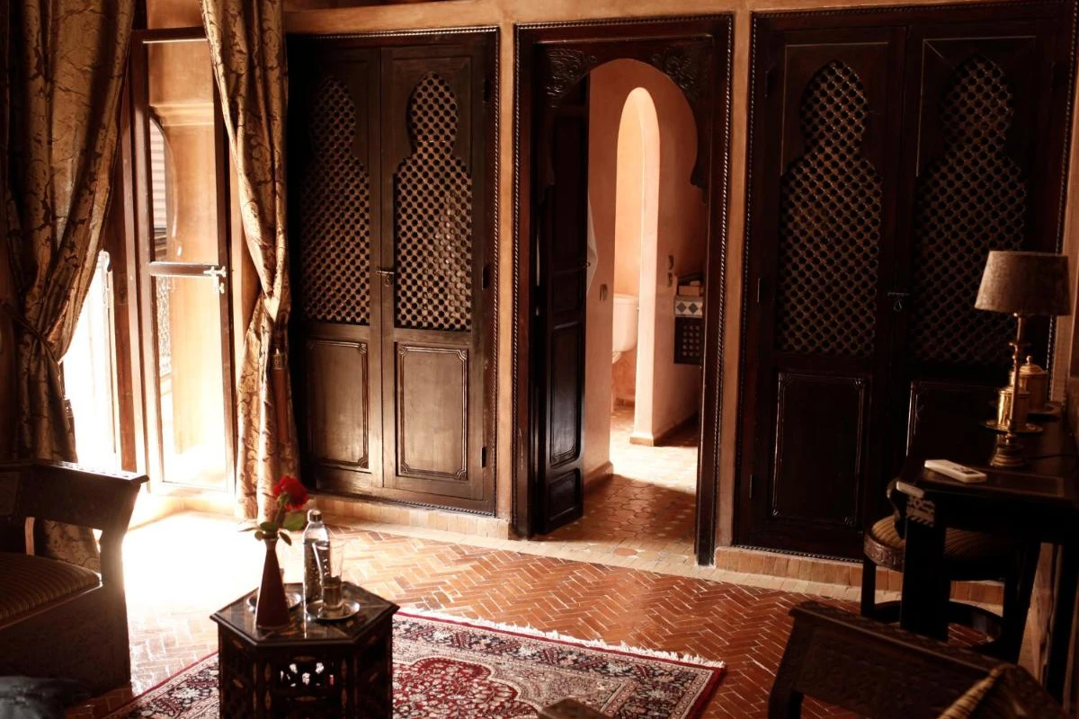 The 7 rooms feature air-conditioned spaces, flat-screen TVs, minibars, and private bathrooms with premium toiletries. Uniquely decorated with Moroccan antiques and furnished seating areas, some rooms offer direct terrace access with views of mandarin tree patios or the Atlas Mountains, creating a restful sanctuary for couples. A rooftop hot tub-style basin adds a refreshing touch.