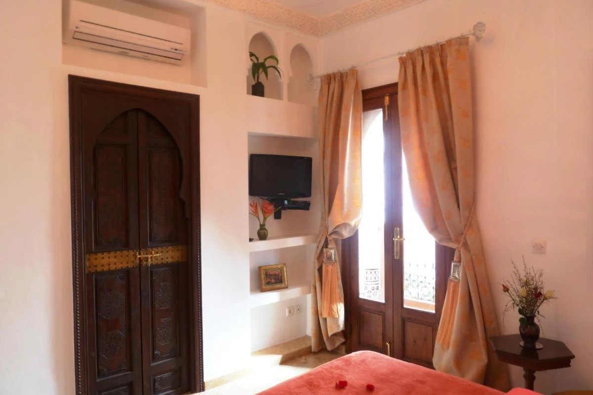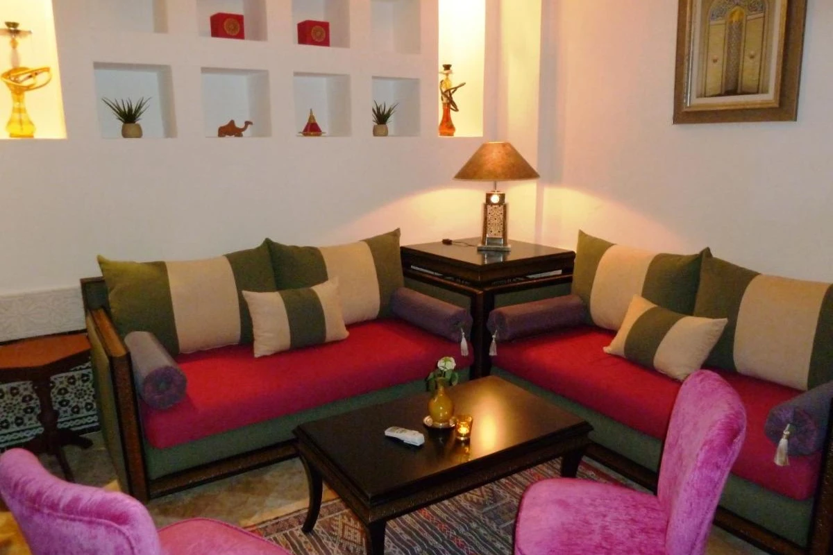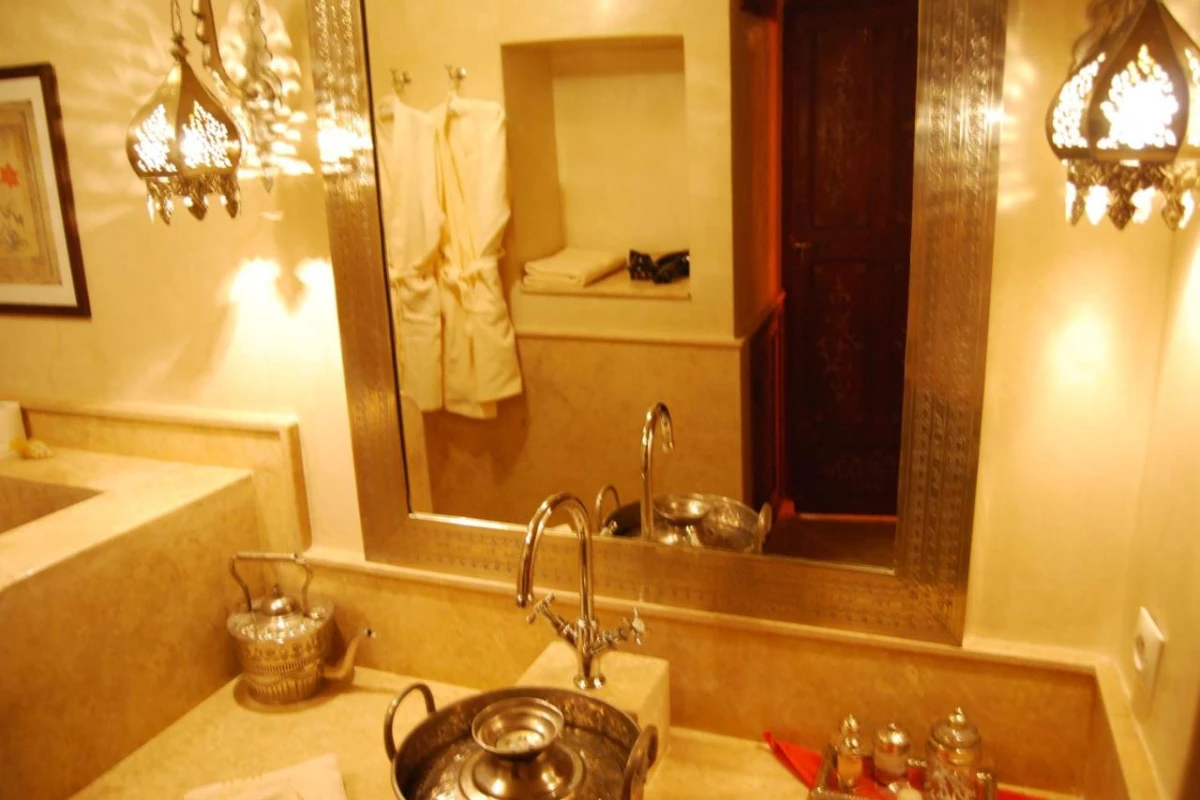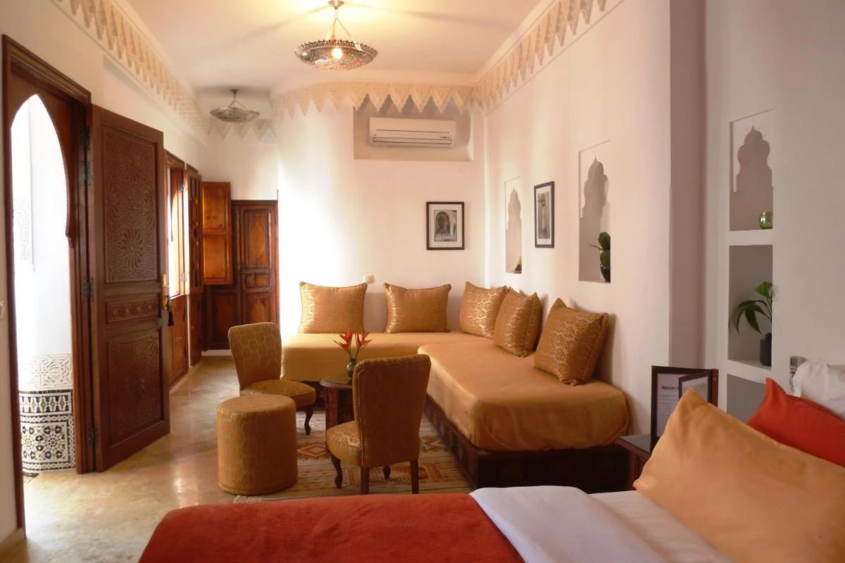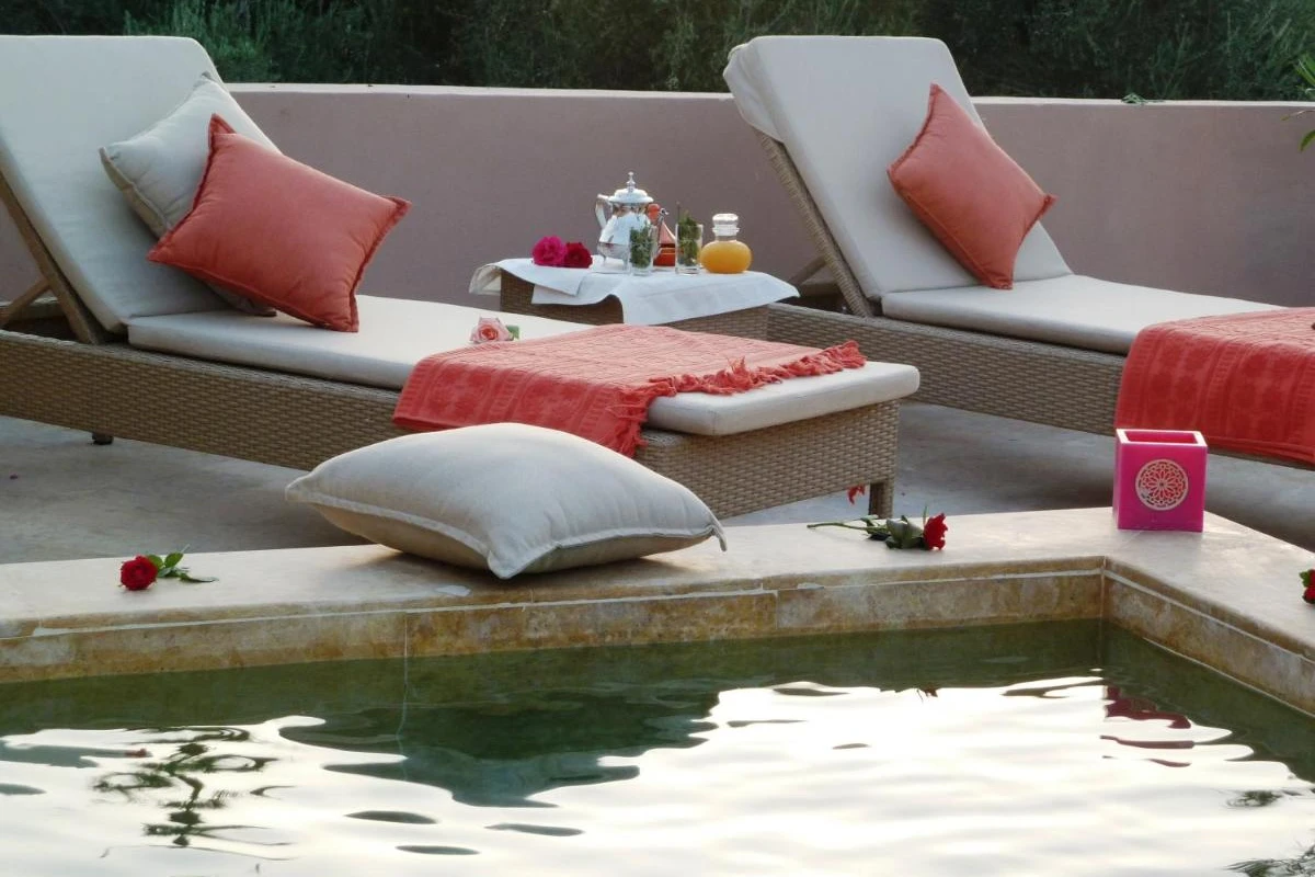 The 7 rooms and suites feature air-conditioned spaces, LCD TVs, minibars, and private bathrooms with premium toiletries. Adorned with Moroccan mosaics, private patios or balconies open to views of the Mamounia hotel's park or Koutoubia Mosque, creating a restful sanctuary for couples. A rooftop pool and lounge add a refreshing touch.