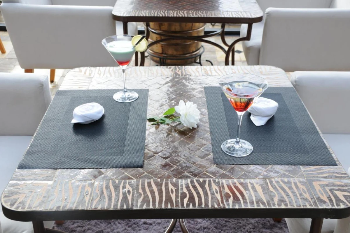 The restaurant serves breakfasts with fresh fruits and Moroccan dishes, enjoyed on the terrace or in a shared lounge. A bar offers mint tea and cocktails, paired with soft oud melodies, crafting an intimate, welcoming vibe.