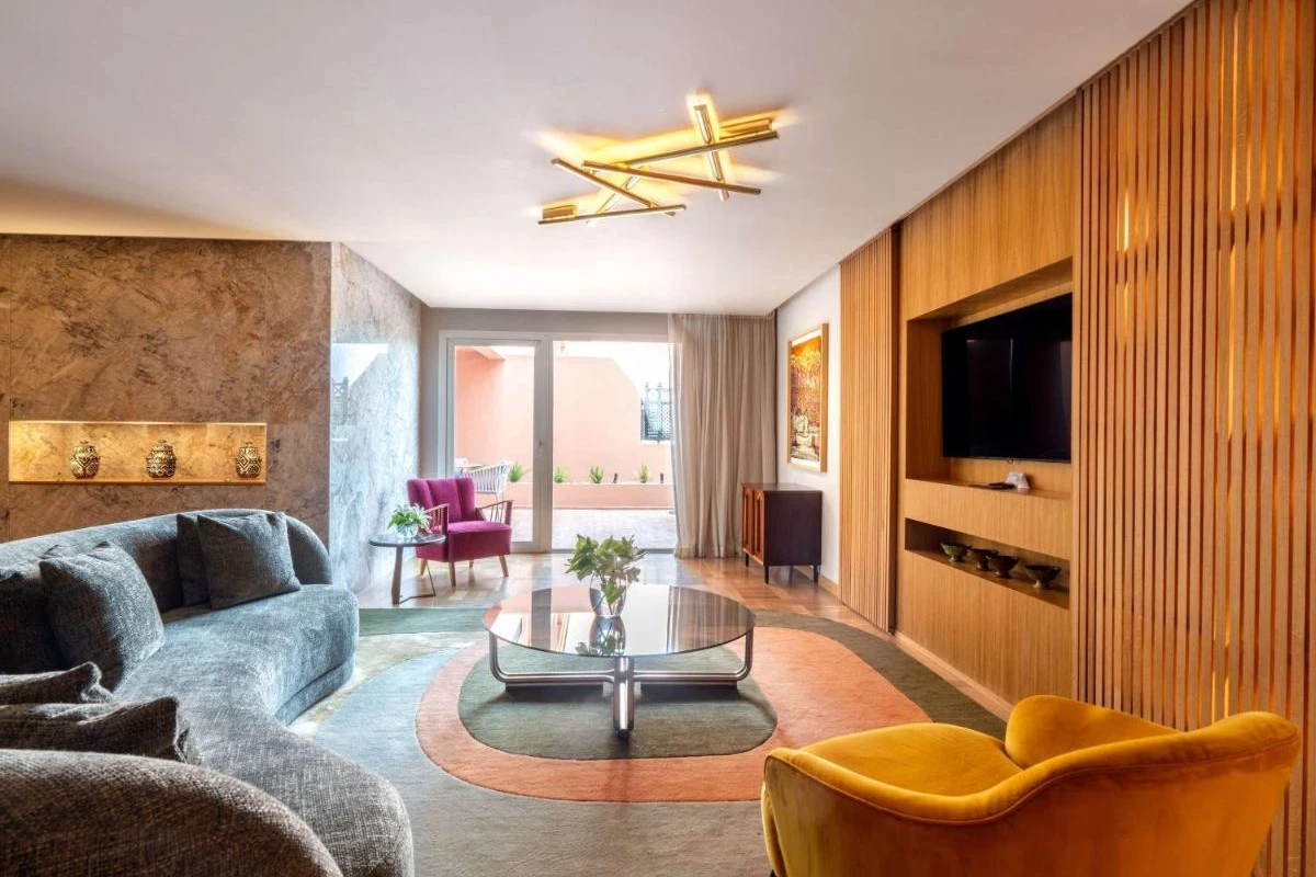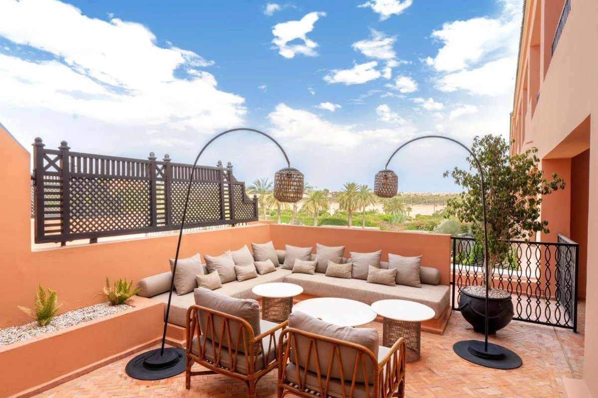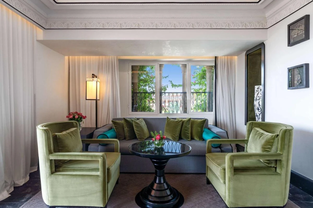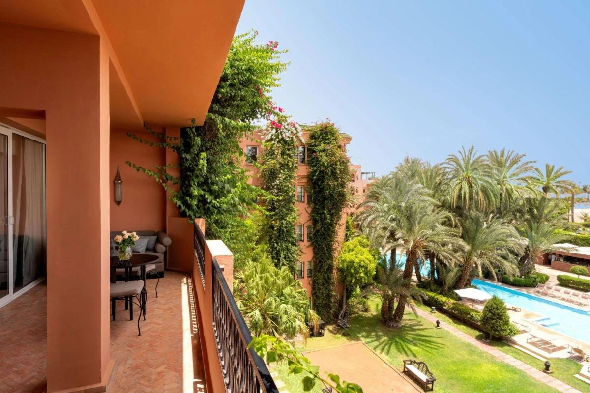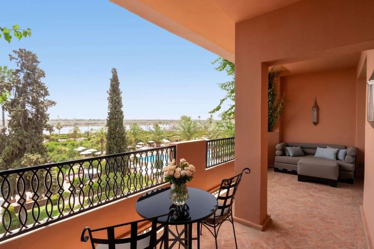The 183 rooms and suites feature air-conditioned spaces, flat-screen TVs, minibars, and private bathrooms with premium toiletries. Private balconies open to lush garden or Atlas Mountain views, with some suites offering separate lounges, creating a restful sanctuary for couples or families. Five pools, including one indoor, add a refreshing touch.