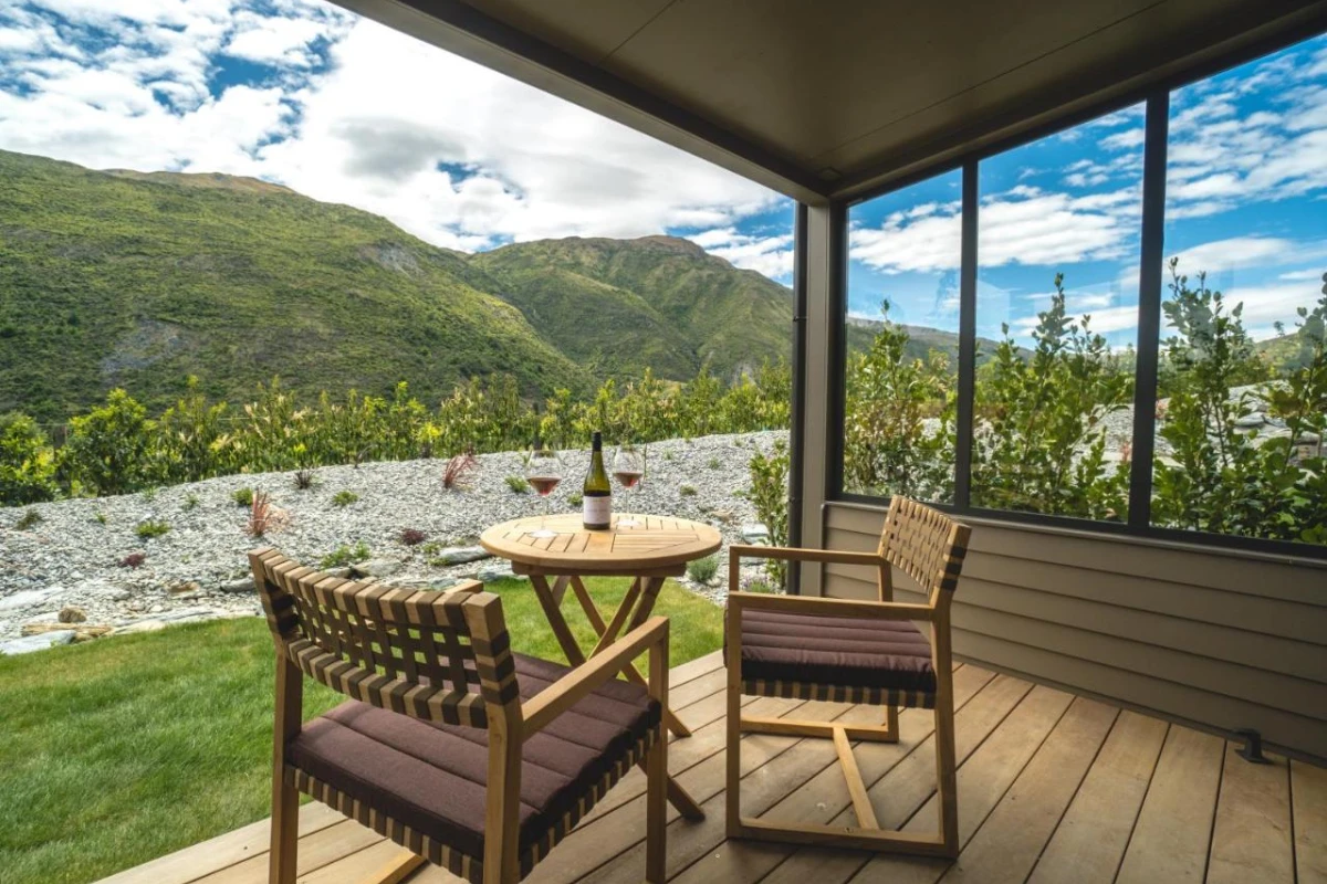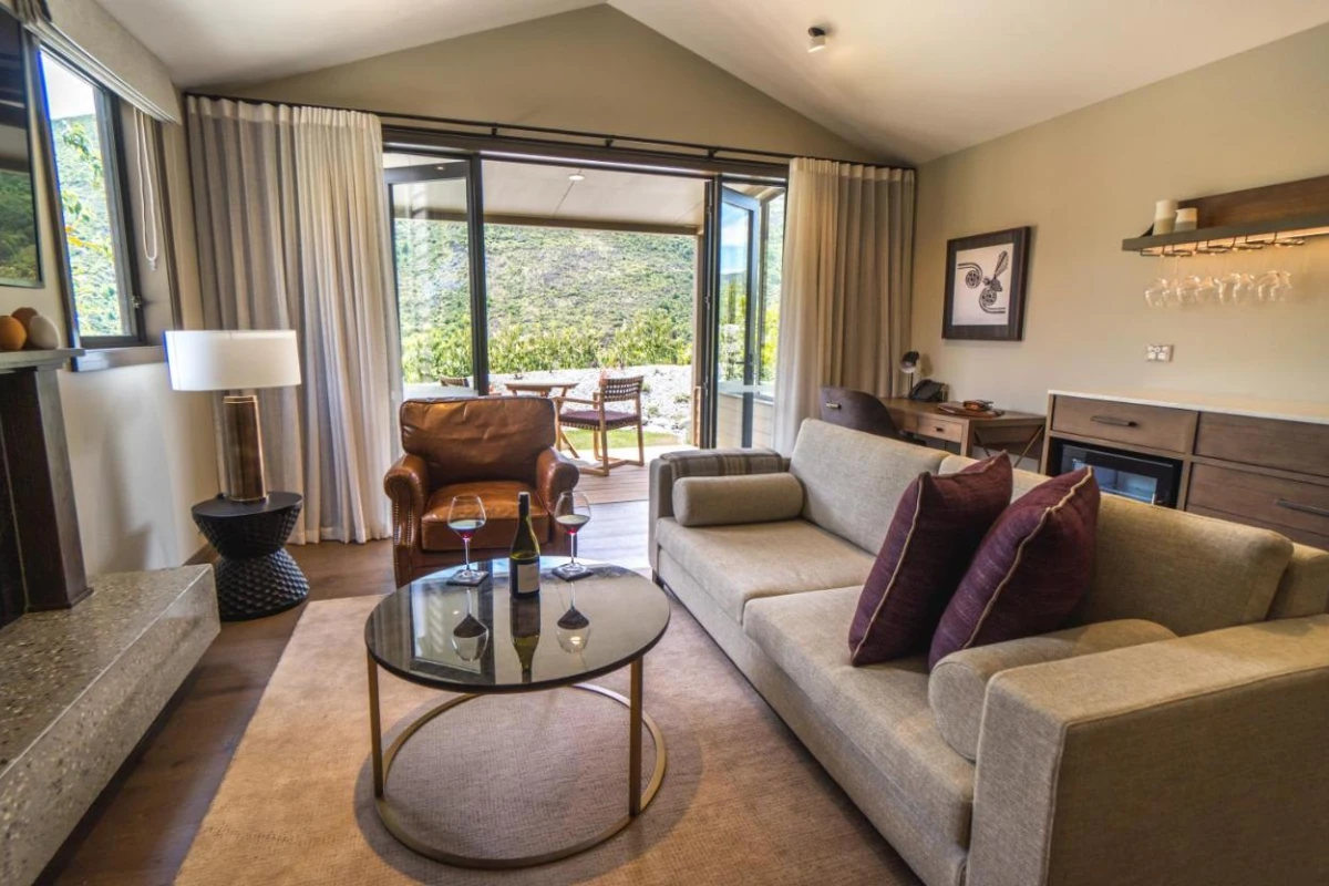 The 24 private villas, designed for sophisticated comfort, feature air-conditioned elegance, flat-screen TVs, spacious indoor living areas, and large bathrooms with walk-in showers, separate baths, dual basins, and premium locally made beauty products. Each villa opens onto a secluded, covered deck and sunny courtyard with views of organic vineyards and Gibbston's mountains, creating a refined sanctuary for couples, families, or wine enthusiasts. Complimentary Wi-Fi ensures seamless connectivity, enhancing the indulgent experience.