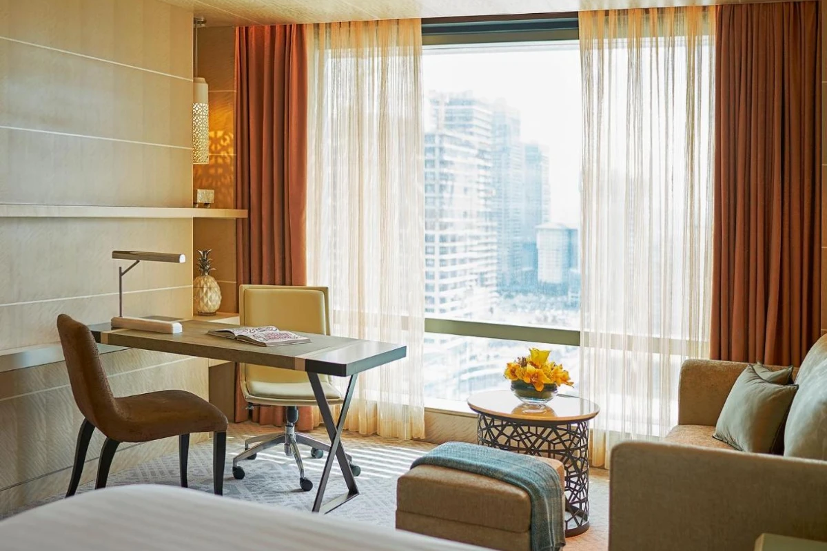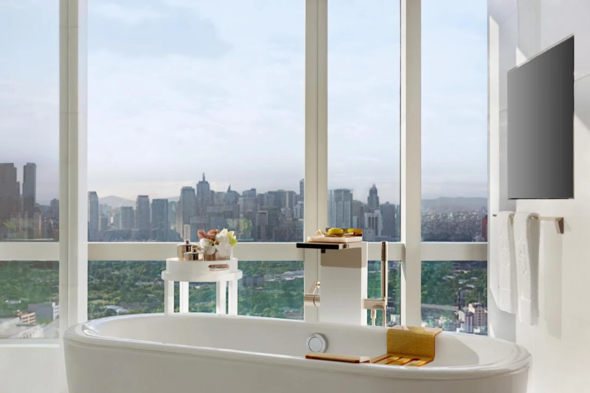 Luxuriously furnished rooms, each with city views, unfold with air conditioning, flat-screen televisions tuned to cable channels, safety deposit boxes, and private bathrooms offering showers or baths, slippers, and complimentary toiletries, creating a serene retreat amid the urban vibrancy.