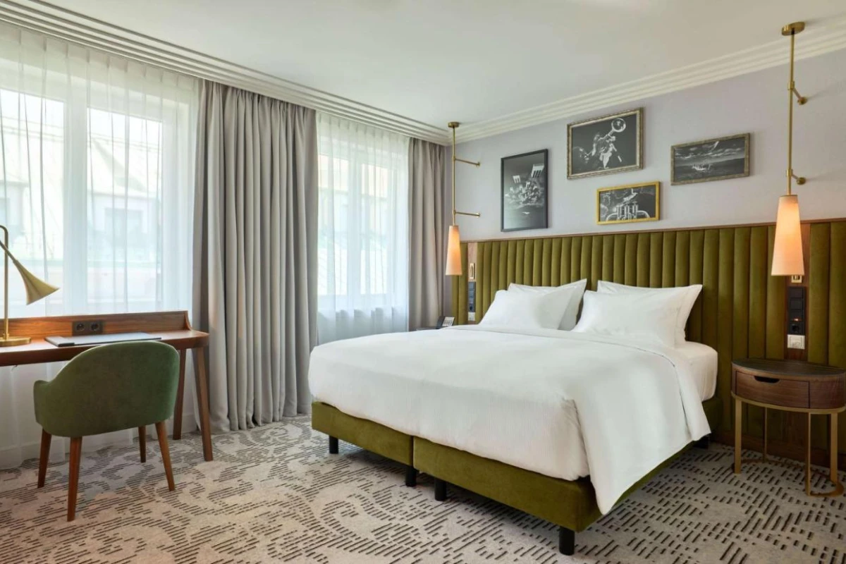 The 117 uniquely designed rooms weave the building's 200-year heritage with modern elegance, featuring air-conditioned comfort, plush bedding, satellite TVs, and work desks, alongside private bathrooms with bathtubs or showers and premium toiletries. Each room reflects the hotel's storied past with bespoke decor, while the meticulously restored ballroom, adorned with original frescoes, evokes its musical grandeur. Modern meeting facilities cater to intimate gatherings or high-end groups, and a clandestine “secret bar” adds an air of intrigue for curious guests.