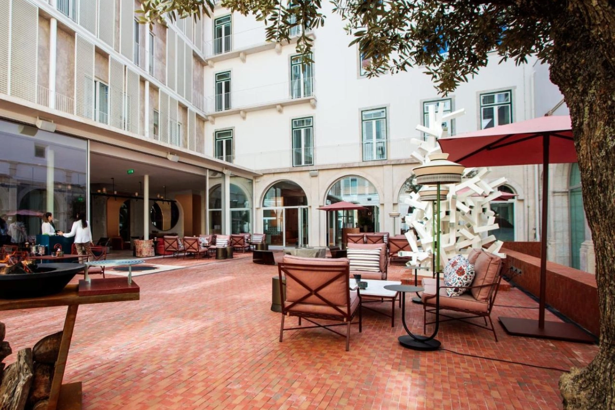 The 121 cozy rooms unfold with sleek sophistication, featuring air-conditioned comfort, flat-screen TVs with cable channels, safety deposit boxes, minibars with local treats like port wine, and pink marble bathrooms with baths or showers and premium toiletries. Plush carpets mimic ancient stone, blush leather headboards, and semicircular mirrors create airy havens, many overlooking the historic courtyard with olive trees. Attentive staff ensure thoughtful touches, from plush linens to warm welcomes, fostering a sense of belonging amid Lisbon's lively pulse.