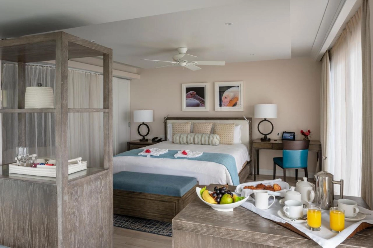 The 155 rooms and suites shimmer with soft island hues, featuring air-conditioned comfort, flat-screen TVs, minibars stocked with local juices, and private bathrooms scented with citrusy REN toiletries. Balconies or patios open to turquoise sea or hibiscus garden views, crafting a cozy haven for couples or solo travellers seeking renewal.