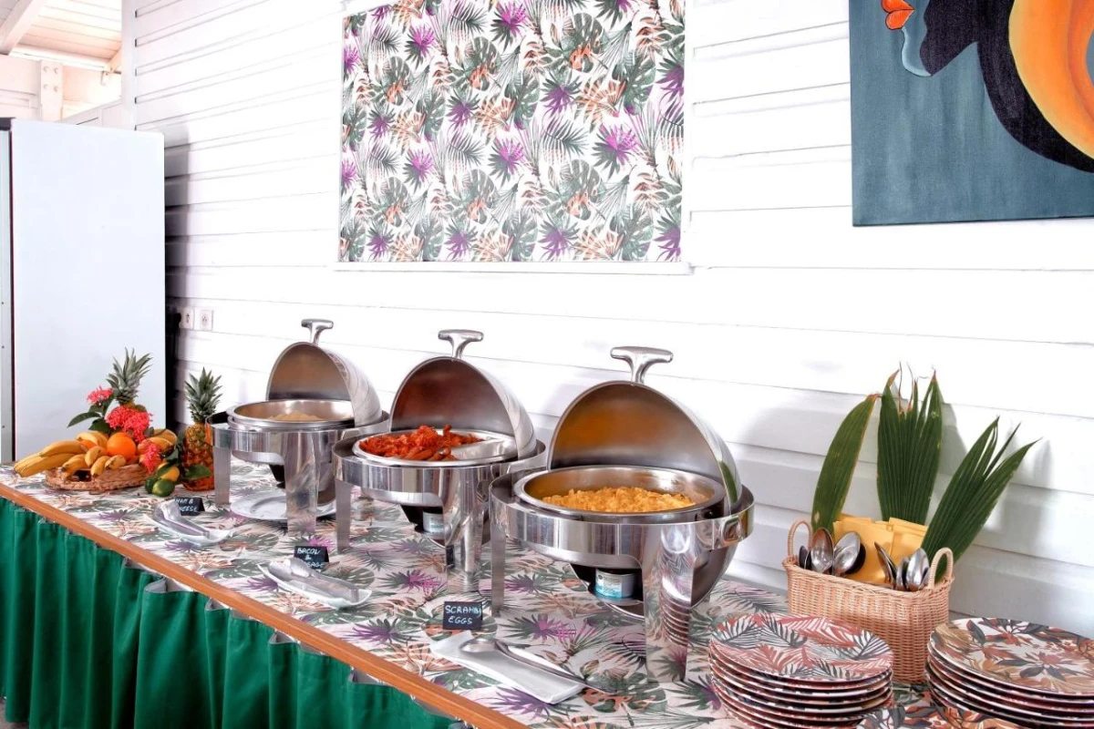 Café La Plantation, poolside, serves a tropical breakfast buffet with fresh fruits and pastries, alongside gourmet evening cuisine with Caribbean and international flavours. Nearby Orient Bay village offers additional dining options. A bar crafts cocktails and wines, complementing relaxed evenings. A private beach, 600 yards away, invites swimming along a 3-mile stretch of white sand, while a tour desk arranges island adventures, weaving in St. Martin's lively spirit.