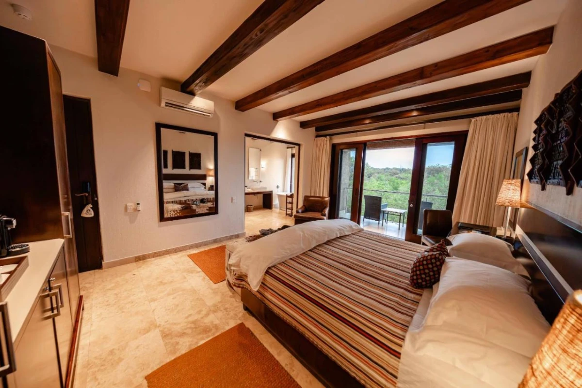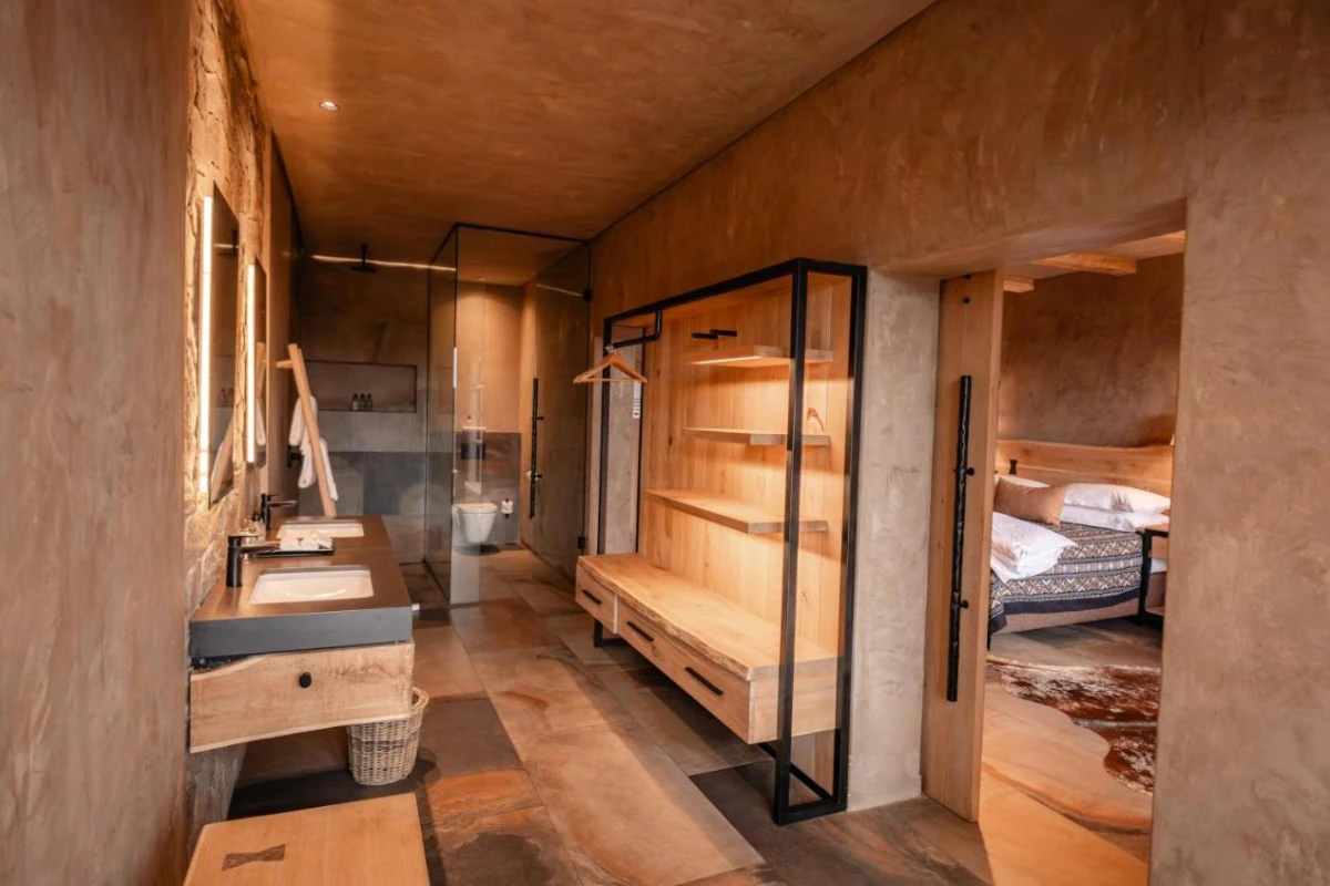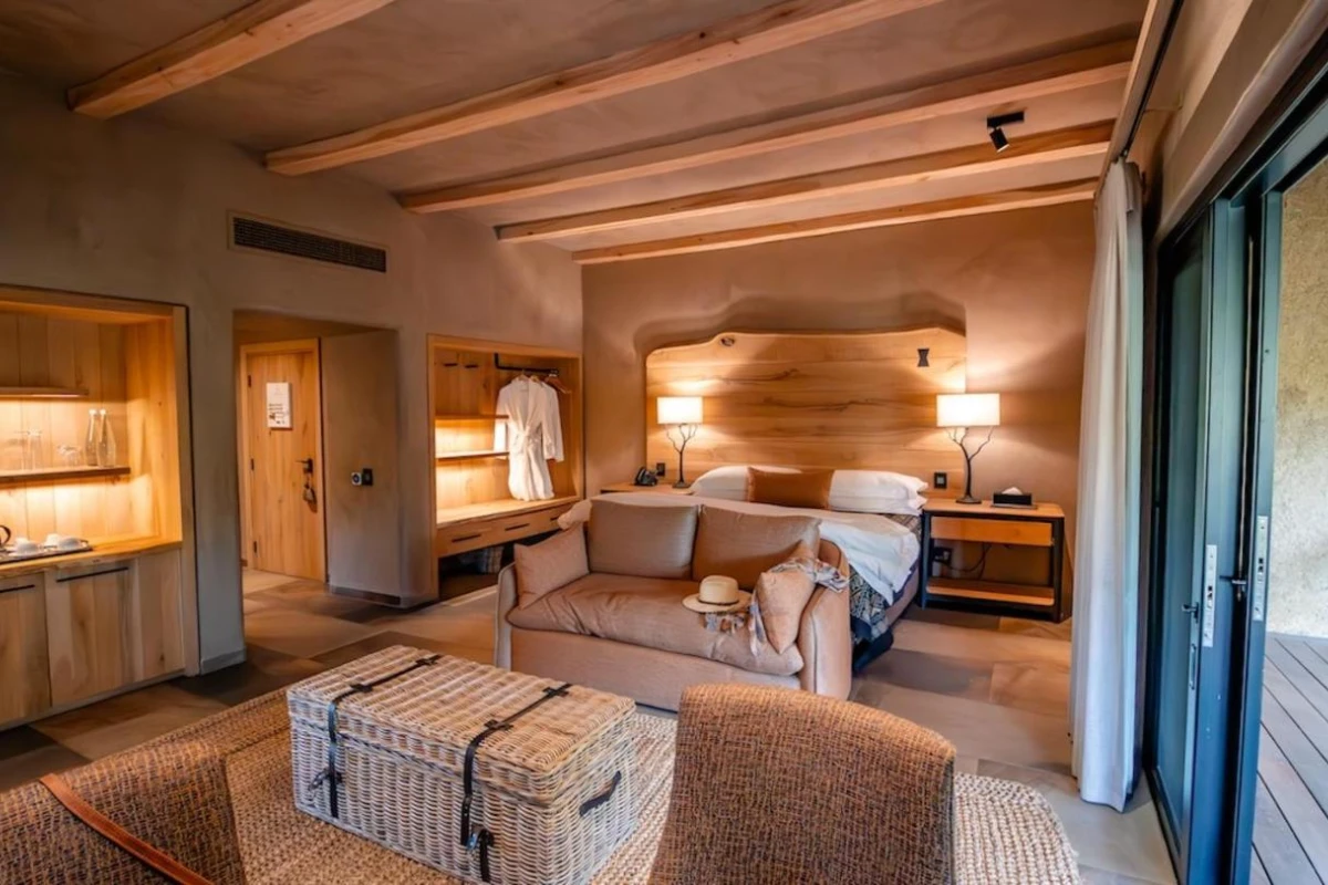 The central guest areas feature a large rim-flow swimming pool with sun umbrellas and recliners, perfect for leisurely afternoons, and a long L-shaped relaxation lounge and bar under a double-volume thatch, creating an open yet intimate atmosphere with a grand double-sided fireplace. The award-winning Spa & Wellness Centre offers rejuvenating treatments, while two daily game drives and a guided bush walk, included in the rates, provide thrilling encounters with the Big 5 and diverse wildlife.