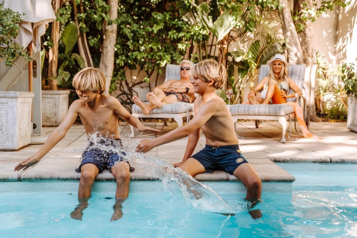A buffet breakfast is served on the covered veranda overlooking the solar-heated swimming pool and wooden deck, framed by stunning Franschhoek Mountain views. Guests can relax with a cool drink from the bar, unwind on sun loungers, or enjoy bespoke spa treatments and picnic baskets for leisurely afternoons, all tailored to enhance the serene experience.