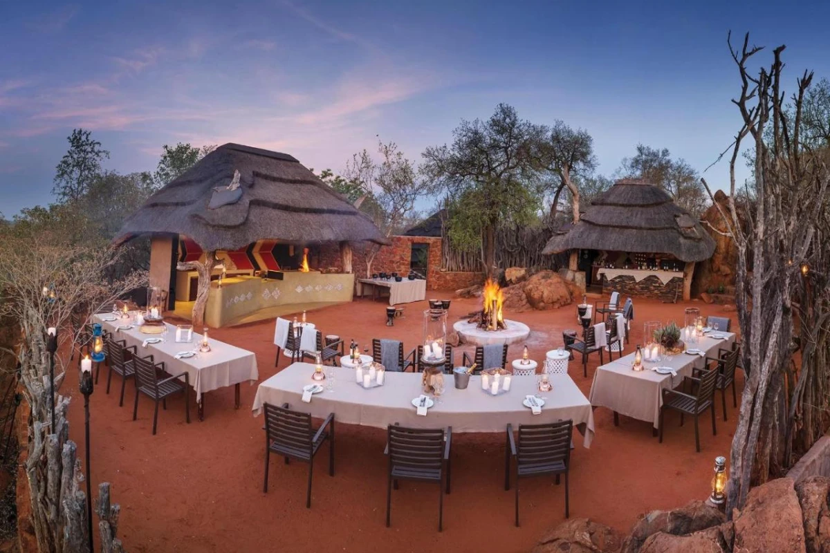 All-inclusive dining features full English and continental breakfasts and lunches on the main deck, with dinners served under starlit skies in the traditional boma or with fine silver service in the elegant dining room, paired with local wines. The lodge's wellness spa, inspired by African healing traditions, offers signature treatments using indigenous botanical ingredients, complemented by a fully equipped gym with treadmills, weights, and aerobic mats. A library, curio shop stocked with local crafts, and a terraced viewing deck overlooking a vibrant waterhole enhance the experience.