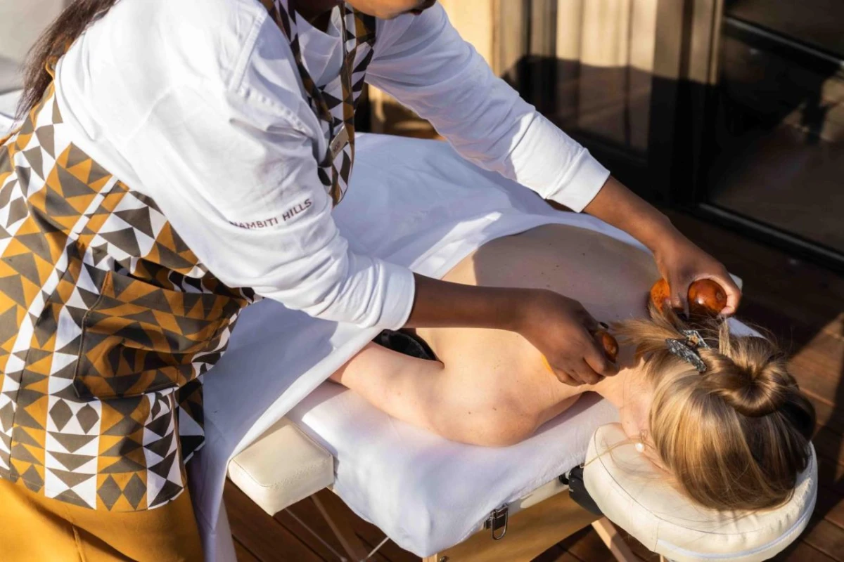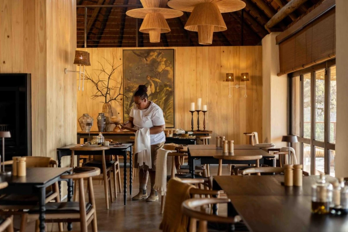 The lodge's restaurant, paired with a curated wine cellar, serves exquisite cuisine, while the lounge area, warmed by fireplaces, opens to a terrace with boma fire bowls overlooking the valley. A stylish bar on the terrace offers refreshing drinks, enhancing the tranquil ambiance. Guests can unwind by the shimmering swimming pool or indulge in rejuvenating treatments at the spa facilities.