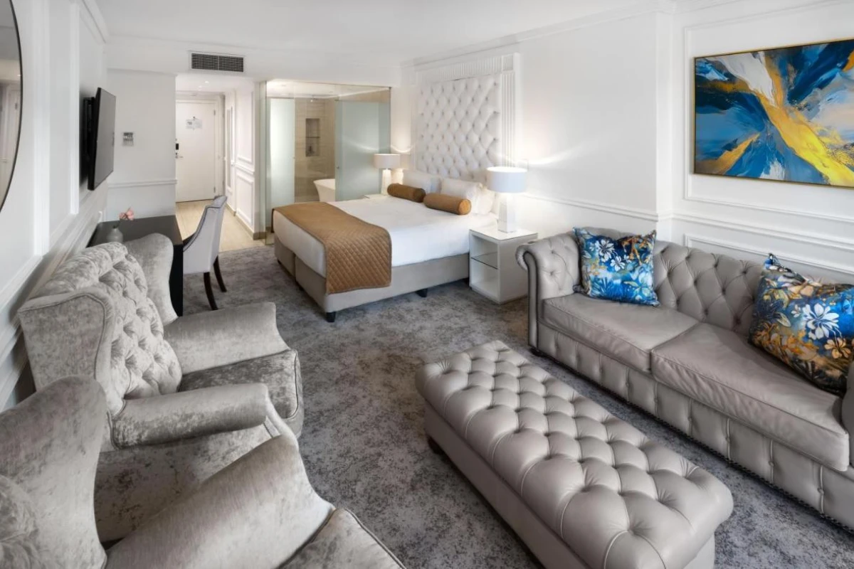 The spacious rooms, ranging from Deluxe Studios to the opulent Presidential Suite, feature extra-length king-sized beds, comfortable armchairs, wall-mounted 42-inch plasma televisions, refrigerators, coffeemakers, and electronic laptop safes, with many suites boasting private balconies and free-standing baths showcasing sweeping city and mountain vistas. Air-conditioning, plush bathrobes, slippers, and satellite television enhance the refined comfort of each elegantly appointed space.